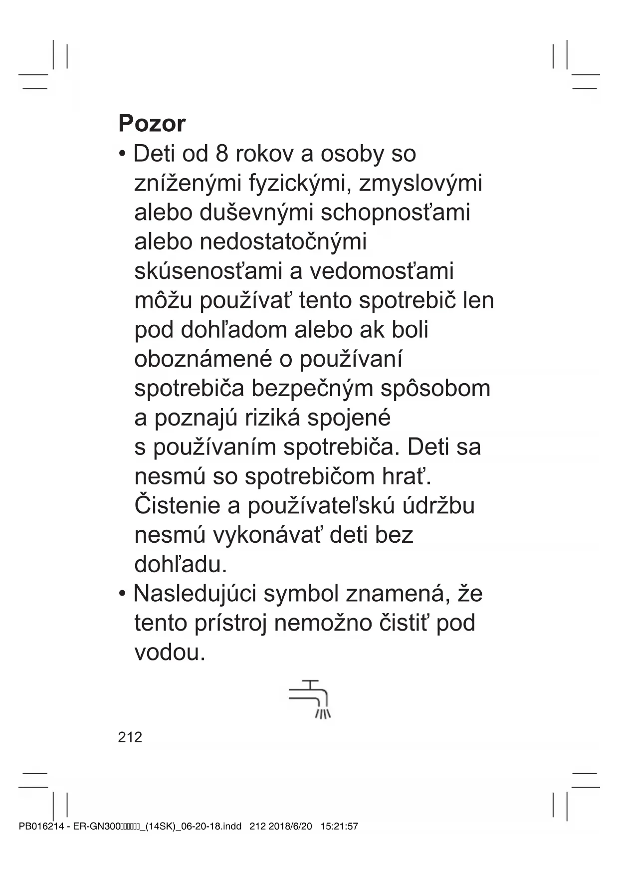 - Nasledujúci symbol znamená, že tento prístroj nemožno čistiť pod vodou. PB016214 - ER-GN300_(14SK)_06-20-18.indd 212 2018/6/20 15:21:57213 Bezpečnostné opatrenia Na zníženie rizika poranení, smrti, zasiahnutia elektrickým prúdom, požiaru a poškodenia majetku vždy dodržiavajte nasledujúce bezpečnostné opatrenia. Vysvetlenie symbolov Nasledujúce symboly sa používajú na klasikovanie a opis stupňa rizika, poranenia a poškodenia majetku v dôsledku nerešpektovania označení a nesprávneho používania. VÝSTRAHA Označuje potenciálne riziko, ktorého dôsledkom môže byť vážne poranenie alebo smrť. UPOZORNENIE Označuje riziko, ktorého dôsledkom môže byť menšie poranenie alebo poškodenie majetku. Nasledujúce symboly sa používajú na klasikovanie a opis typov pokynov, ktoré je nutné dodržiavať. Tento symbol sa používa na upozornenie používateľov na špecický prevádzkový postup, ktorý sa nesmie vykonať. Tento symbol sa používa na upozornenie používateľov na špecický prevádzkový postup, ktorý sa musí dodržiavať na bezpečné používanie jednotky. PB016214 - ER-GN300_(14SK)_06-20-18.indd 213 2018/6/20 15:21:57214 VÝSTRAHA Tento výrobok Neuchovávajte v dosahu batoliat a detí. Nedovoľte im používať ho. - Vloženie súčastí alebo príslušenstva do úst môže mať za následok úraz alebo poranenie.