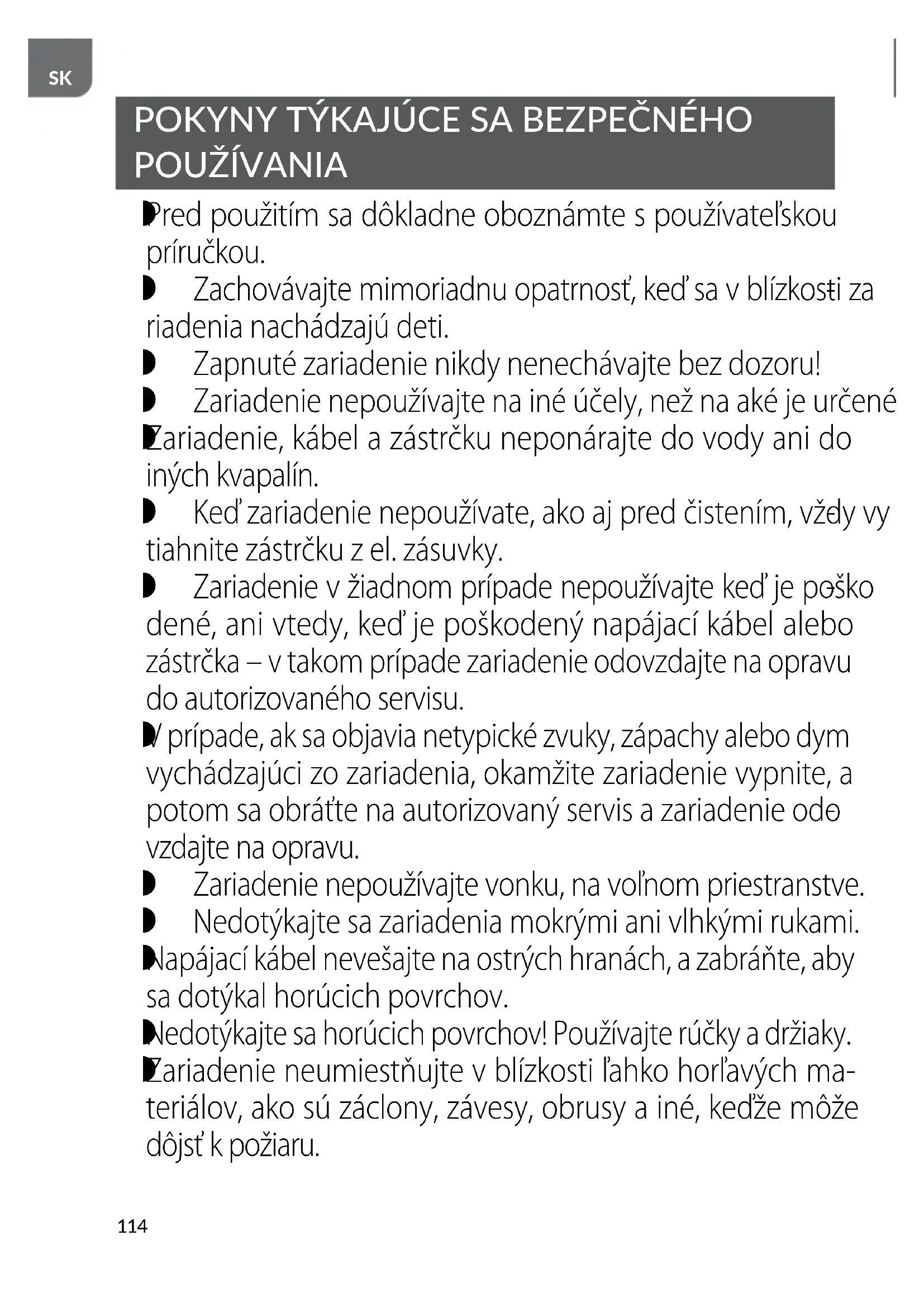 Odporúčame, aby ste fritézu, v ktorej ej horúci olej alebo iná kvapalina, neprenášali a nepremiestňovali, a tiež aby ste používali vhodné bezpečnostné prostriedky. Zariadenie používajte v súlade s jeho určením.116
