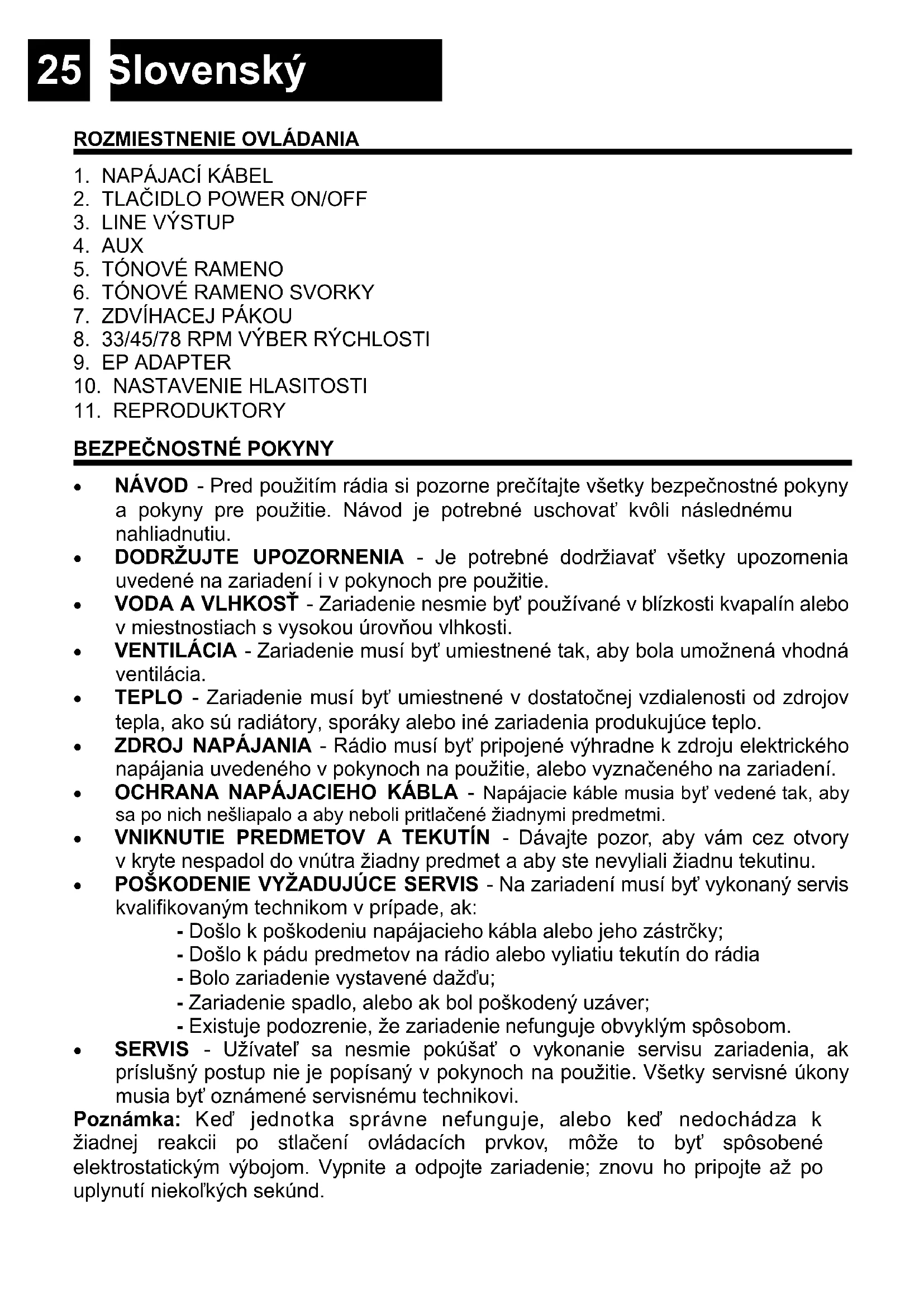NÁVOD - Pred použitím rádia si pozorne prečítajte všetky bezpečnostné pokyny a pokyny pre použitie. Návod je potrebné uschovať kvôli následnému nahliadnutiu. DODRŽUJTE UPOZORNENIA - Je potrebné dodržiavať všetky upozornenia uvedené na zariadení i v pokynoch pre použitie. VODA A VLHKOSŤ - Zariadenie nesmie byť používané v blízkosti kvapalín alebo v miestnostiach s vysokou úrovňou vlhkosti. VENTILÁCIA - Zariadenie musí byť umiestnené tak, aby bola umožnená vhodná ventilácia. TEPLO - Zariadenie musí byť umiestnené v dostatočnej vzdialenosti od zdrojov tepla, ako sú radiátory, sporáky alebo iné zariadenia produkujúce teplo. ZDROJ NAPÁJANIA - Rádio musí byť pripojené výhradne k zdroju elektrického napájania uvedeného v pokynoch na použitie, alebo vyznačeného na zariadení. OCHRANA NAPÁJACIEHO KÁBLA - Napájacie káble musia byť vedené tak, aby sa po nich nešliapalo a aby neboli pritlačené žiadnymi predmetmi. VNIKNUTIE PREDMETOV A TEKUTÍN - Dávajte pozor, aby vám cez otvory v kryte nespadol do vnútra žiadny predmet a aby ste nevyliali žiadnu tekutinu. POŠKODENIE VYŽADUJÚCE SERVIS - Na zariadení musí byť vykonaný servis kvalifikovaným technikom v prípade, ak: - Došlo k poškodeniu napájacieho kábla alebo jeho zástrčky; - Došlo k pádu predmetov na rádio alebo vyliatiu tekutín do rádia - Bolo zariadenie vystavené dažďu; - Zariadenie spadlo, alebo ak bol poškodený uzáver; - Existuje podozrenie, že zariadenie nefunguje obvyklým spôsobom. SERVIS - Užívateľ sa nesmie pokúšať o vykonanie servisu zariadenia, ak príslušný postup nie je popísaný v pokynoch na použitie. Všetky servisné úkony musia byť oznámené servisnému technikovi. Poznámka: Keď jednotka správne nefunguje, alebo keď nedochádza k žiadnej reakcii po stlačení ovládacích prvkov, môže to byť spôsobené elektrostatickým výbojom. Vypnite a odpojte zariadenie; znovu ho pripojte až po uplynutí niekoľkých sekúnd.26 Slovenský NAPÁJANIE Do Vášho stereofónneho systému pripojte napájací kábel do zásuvky (1) a druhý koniec do sieťovej zásuvky. Pred pripojením prístroja k elektrickej sieti prekontrolujte (napr. Na štítku elektromera), či napätie elektrickej siete v mieste používania prístroja zodpovedá napätiu špecifikovanému výrobcom prístroja pre jeho napájanie.