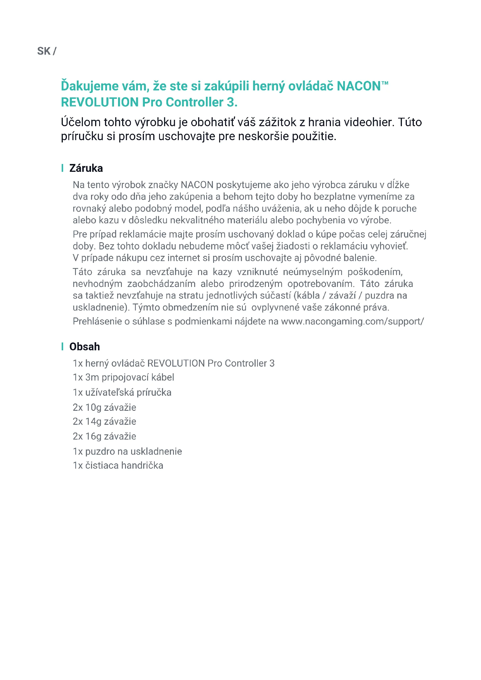 Arcade (okamžitá odozva páčok).SK / Recyklácia S týmto výrobkom by sa nemalo nakladať ako s bežným domácim odpadom. Namiesto toho ho prosím zaneste na príslušné zberné miesto. Recyklácia je dôležitá, pretože znižovaním množstva odpadu na skládkach prispieva k ochrane životného prostredia. Platí iba pre EU a Turecko. I Dôležité bezpečnostné opatrenia 1/ Tento výrobok je určený k použitiu výlučne vo vnútorných priestoroch. Nevysta- vujte ho priamemu slnečnému žiareniu alebo zlému počasiu. 2/ Výrobok nevystavujte striekajúcej vode, kvapkám dažďa alebo vlhkosti. Ne- ponárajte ho do kvapaliny. 3/ Výrobok nevystavujte prachu, vysokej vlhkosti, vysokým teplotám alebo mecha- nickému šoku. 4/ Výrobok nepoužívajte, ak je poškodený. Výrobok nerozoberajte, vo vnútri nie sú žiadne opraviteľné súčasti. 5/ K čisteniu povrchu používajte výhradne jemnú, čistú a vlhkú handričku. Čistiace prostriedky môžu poškodiť povrchovú úpravu a preniknúť dovnútra. 6/ Výrobok neprenášajte uchytením za kábel. 7/ Toto zariadenie nie je navrhnuté pre používanie osobami so zníženými fy- zickými, zmyslovými alebo duševnými schopnosťami, alebo osobami bez po- trebných skúseností či znalostí, ak predtým neboli poučené alebo nedostali inštrukcie ohľadne používania tohto zariadenia od osoby zodpovednej za ich bezpečnosť. Výrobok nenechávajte bez dozoru a uchovávajte ho mimo dosahu detí. Nevhodné pre deti mladšie ako sedem rokov, kvôli riziku omotania kábla okolo krku. I Ergonómia Držanie rúk v rovnakej pozícii môže po dlhšej dobe vyvolať bolesť. Ak k tomu dochádza opakovane, poraďte sa prosím s lekárom. Ako prevenciu vám odporúčame, aby ste si každú hodinu urobili pätnásťminútovú prestávku.SK / I Informácie o technickej podpore E-mail: support@nacongaming.com Web: www.nacongaming.comwww.nacongaming.com @NaconGaming Nacongaming Nacon International