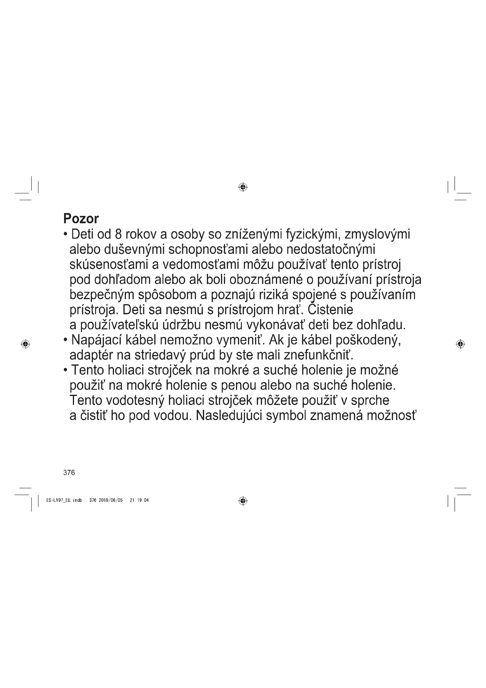 V opačnom prípade môže dôjsť k zasiahnutiu elektrickým prúdom alebo poraneniu. Svoj holiaci strojček nepožičiavajte iným členom rodiny ani iným osobám.