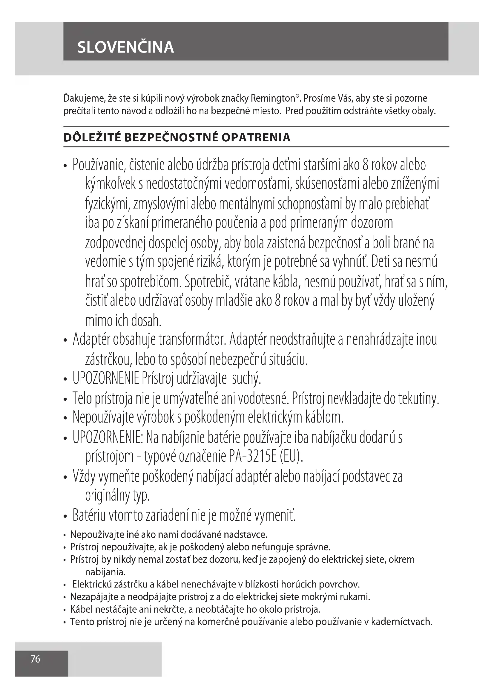 AE76 Ďakujeme, že ste si kúpili nový výrobok značky Remington®. Prosíme Vás, aby ste si pozorne prečítali tento návod a odložili ho na bezpečné miesto. Pred použitím odstráňte všetky obaly.