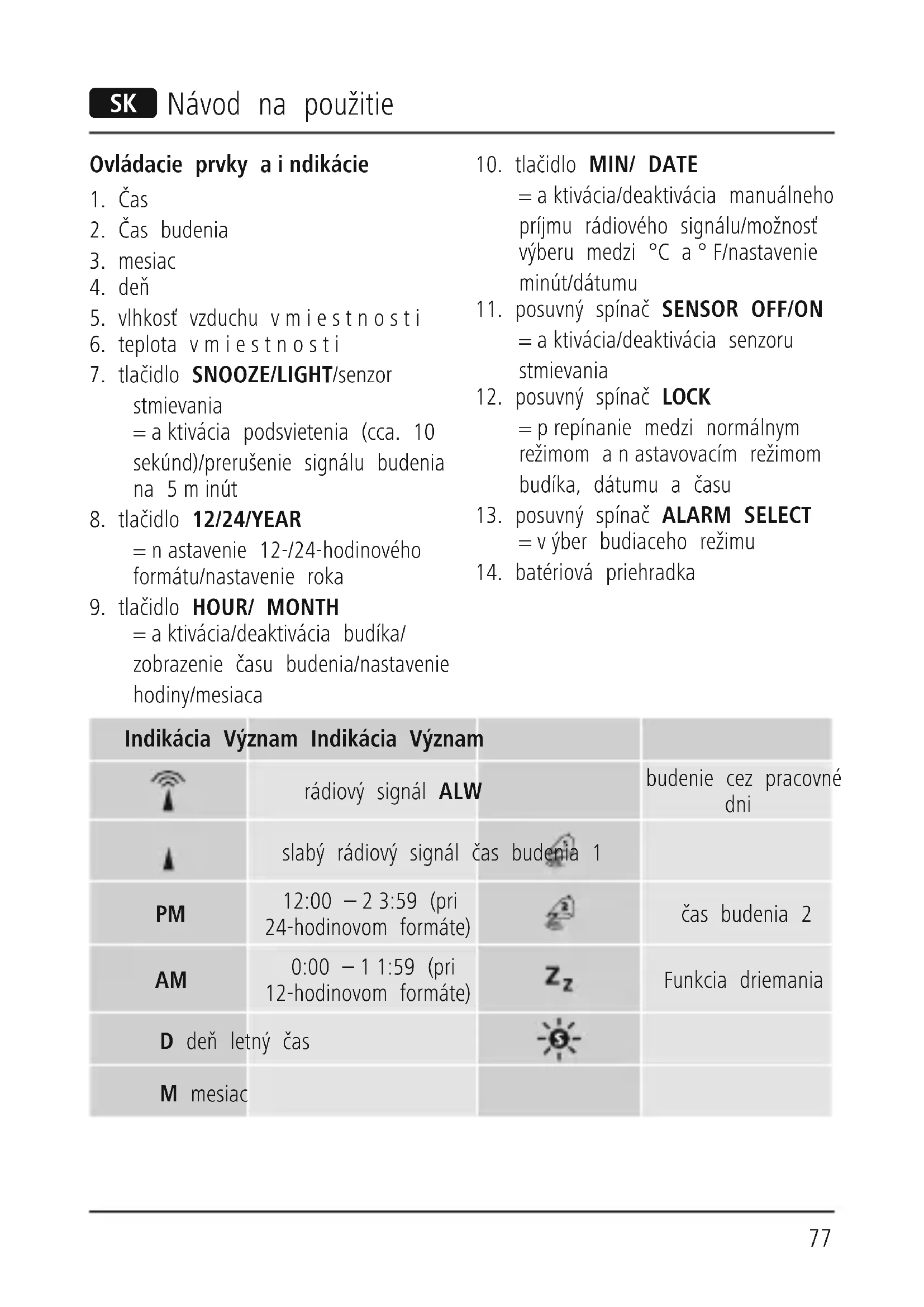 - Na uloženie nastavení anávrat do normálneho režimu posuňte posuvný spínač LOCK (12) na pozíciu LOCK. Zvolenie 12-hodinového alebo 24-hodinového formátu času