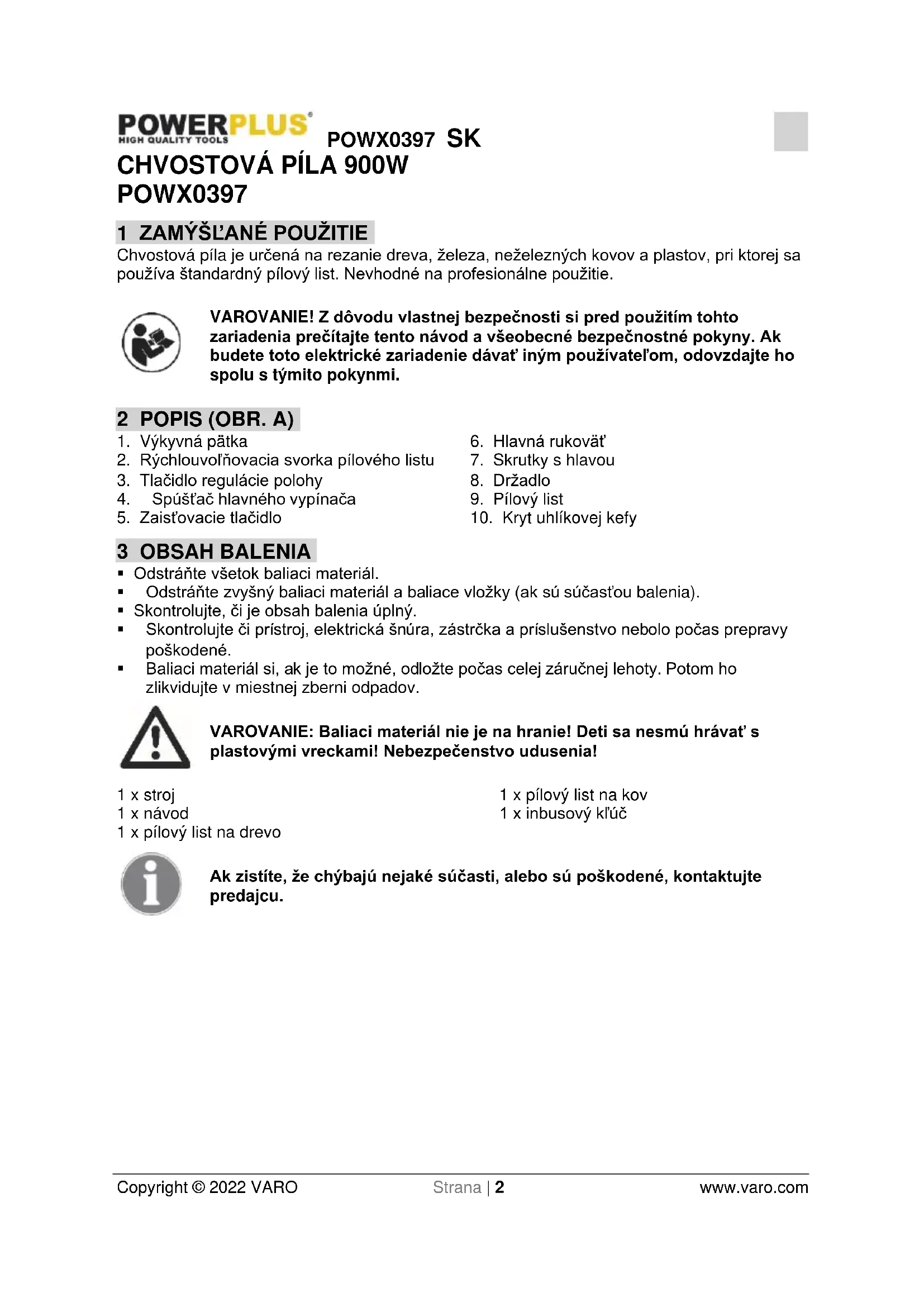 - Baliaci materiál si, ak je to možné, odložte počas celej záručnej lehoty. Potom ho zlikvidujte v miestnej zberni odpadov. VAROVANIE: Baliaci materiál nie je na hranie! Deti sa nesmú hrávať s plastovými vreckami! Nebezpečenstvo udusenia! 1 x stroj 1 x návod 1 x pílový list na drevo 1 x pílový list na kov 1 x inbusový kľúč Ak zistíte, že chýbajú nejaké súčasti, alebo sú poškodené, kontaktujte predajcu.POWX0397 SK Copyright © 2022 VARO Strana | 3 www.varo.com 4 SYMBOLY V tomto návode a/alebo na stroji sa používajú nasledujúce symboly:
