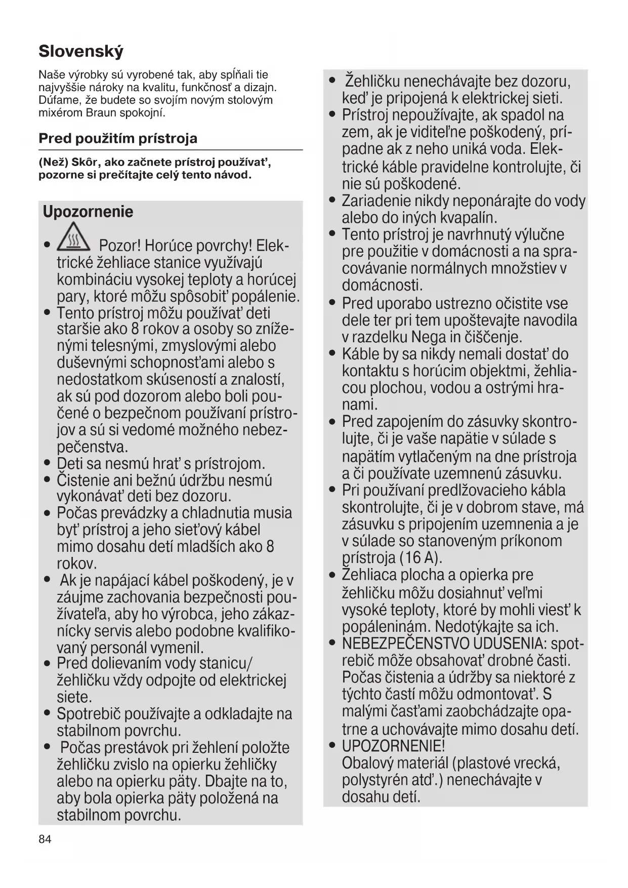 Pozor! Horúce povrchy! Elek- trické žehliace stanice využívajú kombináciu vysokej teploty a horúcej pary, ktoré môžu spôsobiť popálenie.