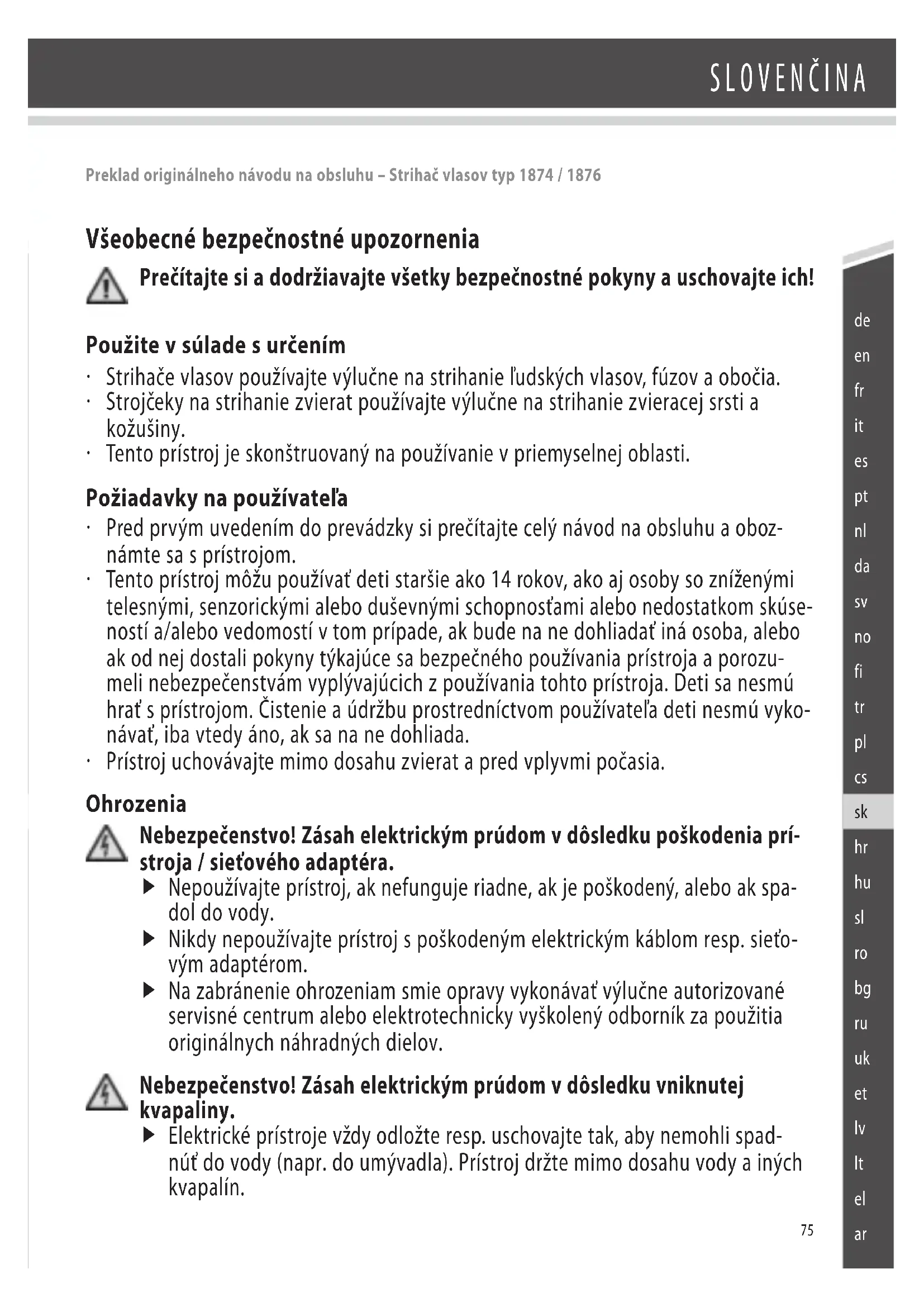 - Prístroj uchovávajte mimo dosahu zvierat a pred vplyvmi počasia. Ohrozenia Nebezpečenstvo! Zásah elektrickým prúdom v dôsledku poškodenia prí- stroja / sieťového adaptéra. f Nepoužívajte prístroj, ak nefunguje riadne, ak je poškodený, alebo ak spa- dol do vody. f Nikdy nepoužívajte prístroj spoškodeným elektrickým káblom resp. sieťo- vým adaptérom. f Na zabránenie ohrozeniam smie opravy vykonávať výlučne autorizované servisné centrum alebo elektrotechnicky vyškolený odborník za použitia originálnych náhradných dielov. Nebezpečenstvo! Zásah elektrickým prúdom v dôsledku vniknutej kvapaliny. f Elektrické prístroje vždy odložte resp. uschovajte tak, aby nemohli spad- núť do vody (napr. do umývadla). Prístroj držte mimo dosahu vody a iných kvapalín. Preklad originálneho návodu na obsluhu – Strihač vlasov typ 1874 / 187676 SLOVENČINA