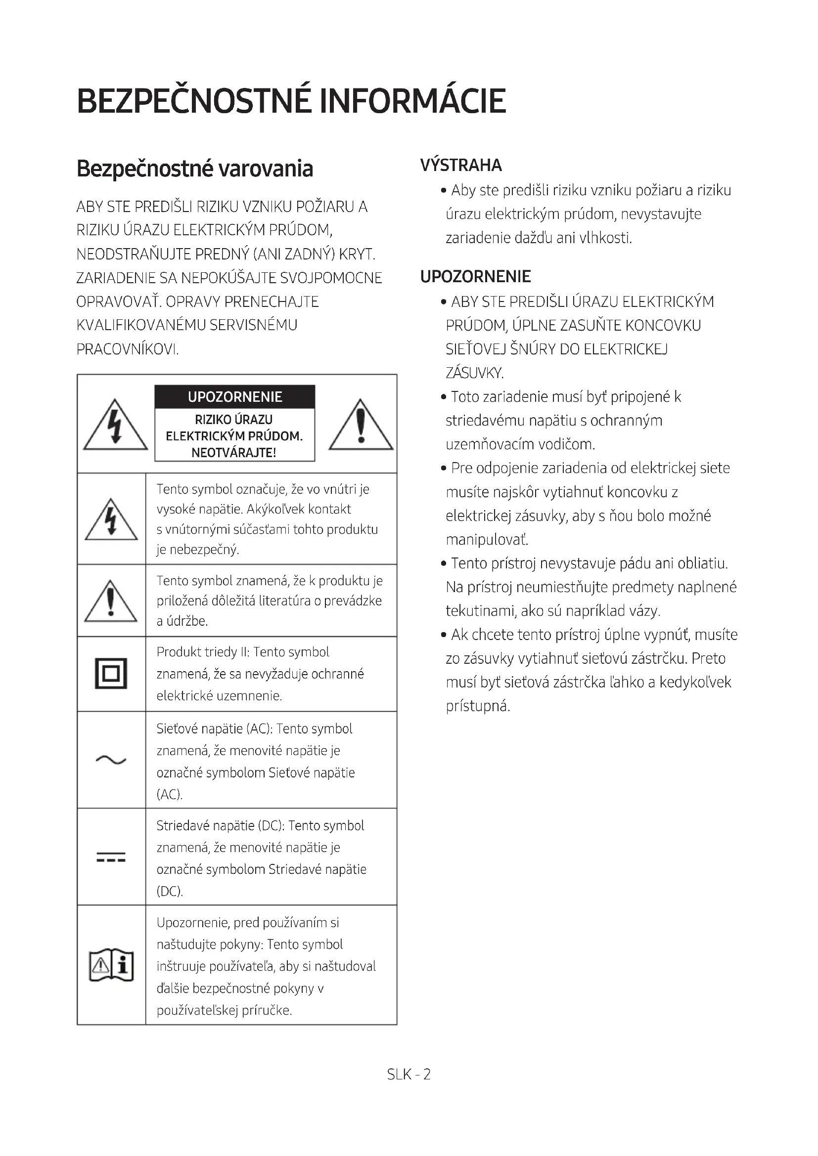 - Ak chcete tento prístroj úplne vypnúť, musíte zo zásuvky vytiahnuť sieťovú zástrčku. Preto musí byť sieťová zástrčka ľahko a kedykoľvek prístupná.SLK - 3 BEZPEČNOSTNÉ OPATRENIA