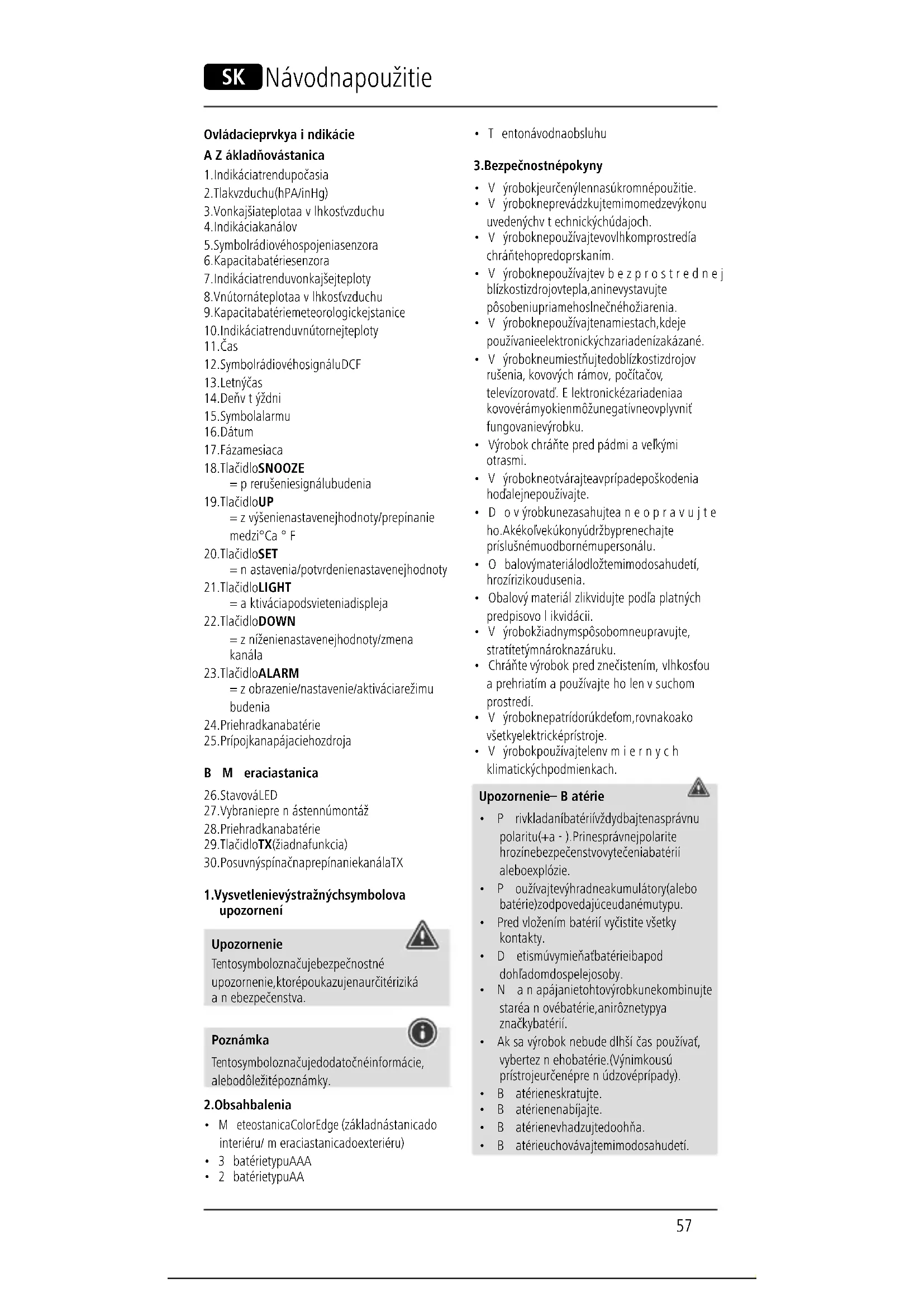 Na čistenie tohto výrobku používajte len navlhčenú utierku, ktorá nepúšťavlákna anepoužívajte žiadne agresívne čistiace prostriedky.Dbajte na to, aby do výrobku nevnikla voda. Meteorologickú stanicu, resp. senzor nikdy neponárajte do vody.Vyhýbajte sa striekajúcej vode.61