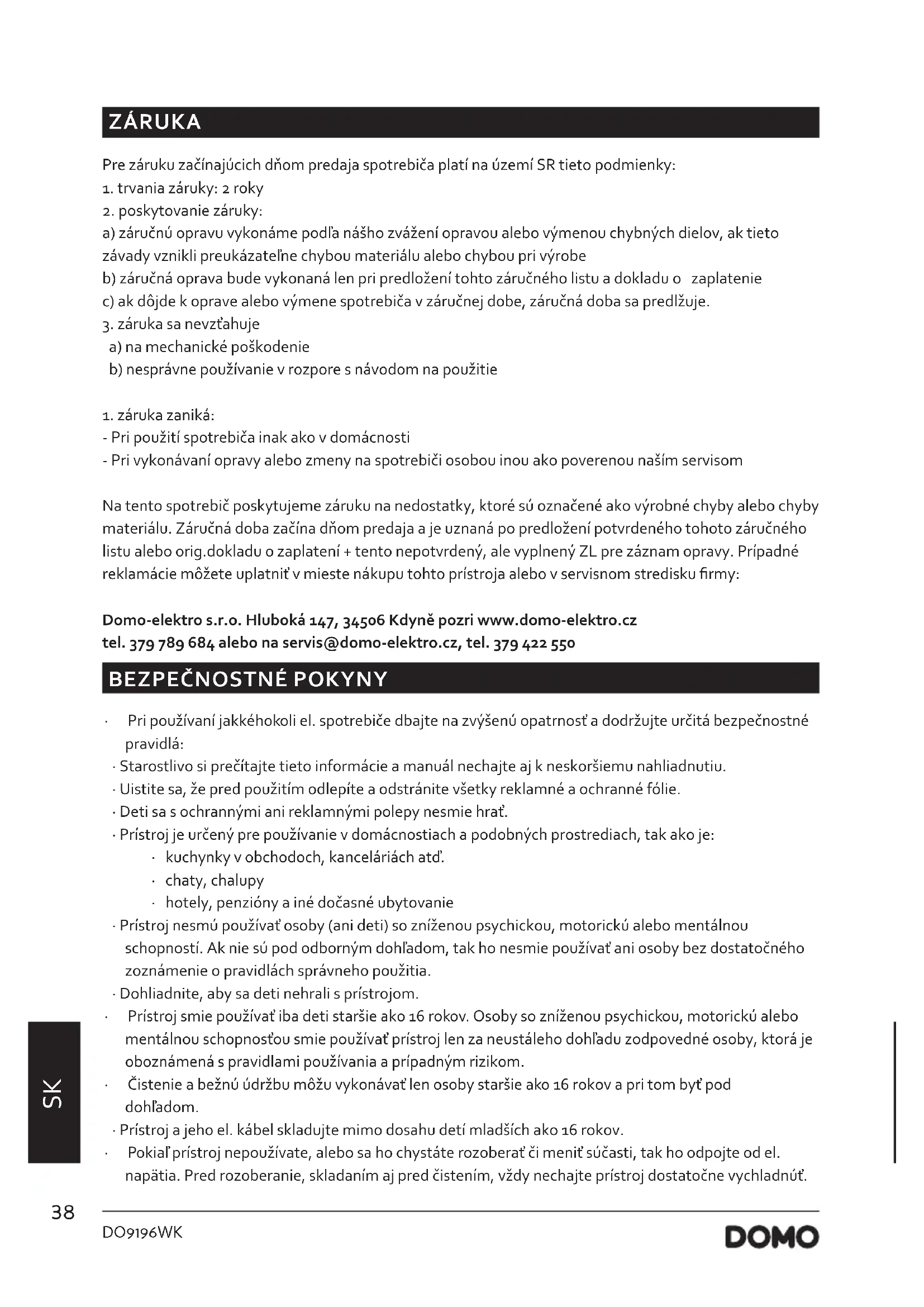 NÁVOD NA OBSLUHU DO9196WK DOMO