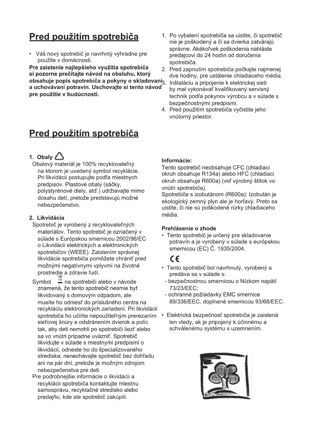 vnútorný priestor. Informácie: Tento spotrebič neobsahuje CFC (chladiaci okruh obsahuje R134a) alebo HFC (chladiaci okruh obsahuje R600a) (viď výrobný štítok vo vnútri spotrebiča). Spotrebiče s izobutánom (R600a): Izobután je ekologický zemný plyn ale je horľavý. Preto sa uistite, či nie sú poškodené rúrky chladiaceho média. Prehlásenie o zhode