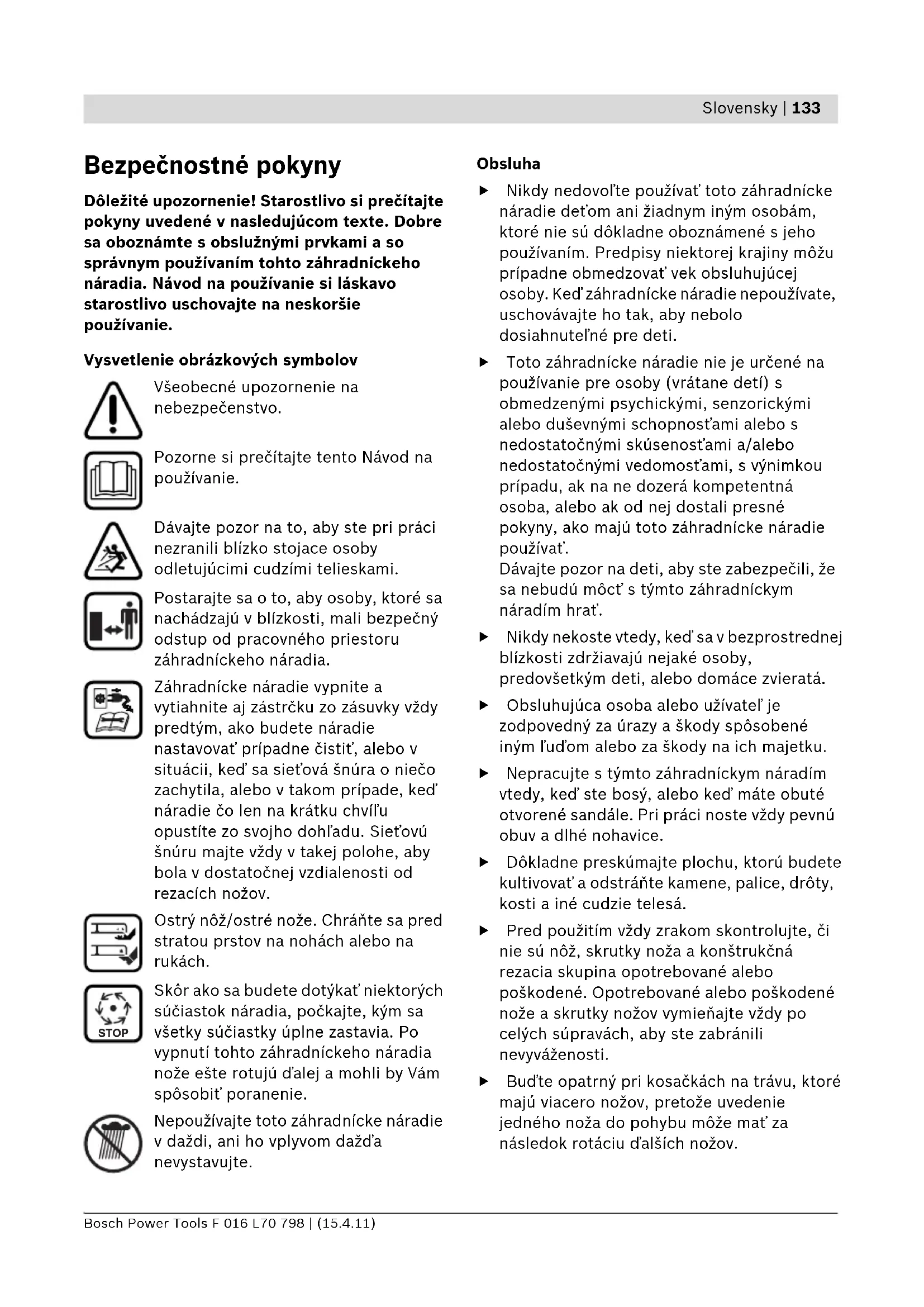 Bezpečnostné pokyny Dôležité upozornenie! Starostlivo si prečítajte pokyny uvedené v nasledujúcom texte. Dobre sa oboznámte s obslužnými prvkami a so správnym používaním tohto záhradníckeho náradia. Návod na používanie si láskavo starostlivo uschovajte na neskoršie používanie. Vysvetlenie obrázkových symbolov Všeobecné upozornenie na nebezpečenstvo. Pozorne si prečítajte tento Návod na používanie. Dávajte pozor na to, aby ste pri práci nezranili blízko stojace osoby odletujúcimi cudzími telieskami. Postarajte sa o to, aby osoby, ktoré sa nachádzajú v blízkosti, mali bezpečný odstup od pracovného priestoru záhradníckeho náradia. Záhradnícke náradie vypnite a vytiahnite aj zástrčku zo zásuvky vždy predtým, ako budete náradie nastavovať prípadne čistiť, alebo v situácii, keď sa sieťová šnúra o niečo zachytila, alebo v takom prípade, keď náradie čo len na krátku chvíľu opustíte zo svojho dohľadu. Sieťovú šnúru majte vždy v takej polohe, aby bola v dostatočnej vzdialenosti od rezacích nožov. Ostrý nôž/ostré nože. Chráňte sa pred stratou prstov na nohách alebo na rukách. Skôr ako sa budete dotýkať niektorých súčiastok náradia, počkajte, kým sa všetky súčiastky úplne zastavia. Po vypnutí tohto záhradníckeho náradia nože ešte rotujú ďalej a mohli by Vám spôsobiť poranenie. Nepoužívajte toto záhradnícke náradie v daždi, ani ho vplyvom dažďa nevystavujte. Obsluha f Nikdy nedovoľte používať toto záhradnícke náradie deťom ani žiadnym iným osobám, ktoré nie sú dôkladne oboznámené s jeho používaním. Predpisy niektorej krajiny môžu prípadne obmedzovať vek obsluhujúcej osoby. Keď záhradnícke náradie nepoužívate, uschovávajte ho tak, aby nebolo dosiahnuteľné pre deti. f Toto záhradnícke náradie nie je určené na používanie pre osoby (vrátane detí) s obmedzenými psychickými, senzorickými alebo duševnými schopnosťami alebo s nedostatočnými skúsenosťami a/alebo nedostatočnými vedomosťami, s výnimkou prípadu, ak na ne dozerá kompetentná osoba, alebo ak od nej dostali presné pokyny, ako majú toto záhradnícke náradie používať. Dávajte pozor na deti, aby ste zabezpečili, že sa nebudú môcť s týmto záhradníckym náradím hrať. f Nikdy nekoste vtedy, keď sa v bezprostrednej blízkosti zdržiavajú nejaké osoby, predovšetkým deti, alebo domáce zvieratá. f Obsluhujúca osoba alebo užívateľ je zodpovedný za úrazy a škody spôsobené iným ľuďom alebo za škody na ich majetku. f Nepracujte s týmto záhradníckym náradím vtedy, keď ste bosý, alebo keď máte obuté otvorené sandále. Pri práci noste vždy pevnú obuv a dlhé nohavice. f Dôkladne preskúmajte plochu, ktorú budete kultivovať a odstráňte kamene, palice, drôty, kosti a iné cudzie telesá. f Pred použitím vždy zrakom skontrolujte, či nie sú nôž, skrutky noža a konštrukčná rezacia skupina opotrebované alebo poškodené. Opotrebované alebo poškodené nože a skrutky nožov vymieňajte vždy po celých súpravách, aby ste zabránili nevyváženosti. f Buďte opatrný pri kosačkách na trávu, ktoré majú viacero nožov, pretože uvedenie jedného noža do pohybu môže mať za následok rotáciu ďalších nožov. STOP OBJ_BUCH-1393-001.book Page 133 Friday, April 15, 2011 10:36 AM134 | Slovensky F 016 L70 798 | (15.4.11) Bosch Power Tools f Pracujte iba za denného svetla alebo za dobrého umelého osvetlenia. f Podľa možnosti nepoužívajte záhradnícke náradie vtedy, keď je tráva mokrá. f Kráčajte vždy pokojne, nikdy rýchlo nebežte. f Práca na svahu môže byť nebezpečná. – Nekoste žiadne príliš strmé svahy. – Na šikmých plochách alebo na mokrej tráve dávajte vždy pozor na bezpečnú chôdzu. – Na šikmých plochách vždy postupujte pri kosení priečne, nikdy nie smerom hore a smerom dole. – Mimoriadne opatrne postupujte pri zmene smeru na svahoch. – Mimoriadnu opatrnosť zachovávajte pri chôdzi dozadu alebo pri ťahaní záhradníckeho náradia smerom dozadu. – Pri kosení trávnika posúvajte záhradnícke náradie vždy smerom dopredu a nikdy ho neťahajte smerom k svojmu telu. f Nože musia byť vždy zastavené, keď potrebujete záhradnícke náradie preklopiť kvôli transportu, keď prechádzate krížom cez plochy, ktoré nie sú zarastené trávou, a keď plánujete záhradnícke náradie prepraviť na inú plochu, ktorú chcete pokosiť, a takisto aj späť. f Záhradnícke náradie pri štartovaní alebo pri spúšťaní motora nenakláňajte, s výnimkou prípadu, ak je to potrebné na spustenie vo vysokej tráve. V takomto prípade stranu odvrátenú od obsluhy nenadvihujte stláčaním rukoväte viac, ako je bezpodmienečne potrebné. Dávajte pozor na to, aby ste mali ruky položené na rukoväti, keď náradie opätovne spúšťate do pracovnej polohy. f Zapnite záhradnícke náradie podľa popisu v Návode na používanie a dávajte pozor na to, aby ste mali chodidlá v dostatočnej vzdialenosti od rotujúcich súčiastok. f Nedávajte svoje ruky ani chodidlá do blízkosti rotujúcich súčiastok ani pod ne. f Keď budete pracovať s týmto záhradníckym náradím, buďte vždy v dostatočnej vzdialenosti od vyhadzovacej zóny. f Záhradnícke náradie nikdy nezdvíhajte ani neprenášajte vtedy, keď je motor v chode. f Toto záhradnícke náradie sa zásadne nesmie používať s poškodenými ochrannými prvkami, krytmi alebo bez bezpečnostných zariadení, ako sú napríklad ochranný kryt a/alebo zberací kôš na trávu. f Mimoriadne opatrne postupujte vtedy, keď na kosačke na trávu vykonávate nastavovacie práce, aby ste sa vyhli zacviknutiu rúk alebo chodidiel medzi pohyblivé nože a pevné súčiastky kosačky na trávu. f Sieťovú a predlžovaciu šnúru majte vždy v takej polohe, aby bola v dostatočnej vzdialenosti od noža. Nôž