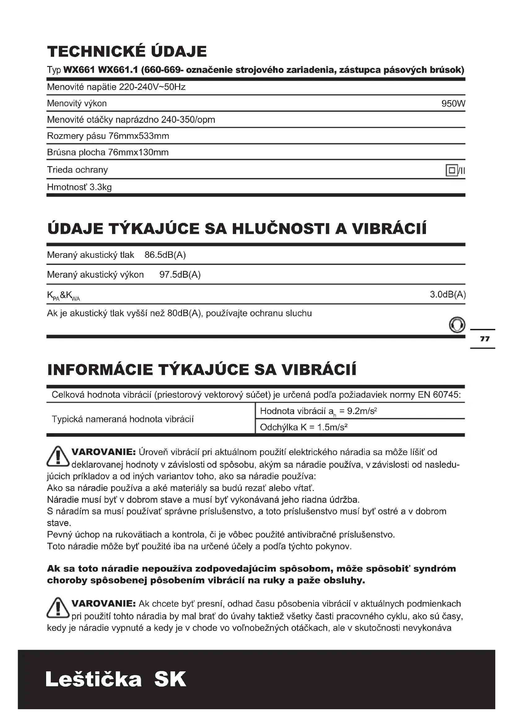| Ak je akustický tlak vyší než 80dB(A), používajte ochranu sluchu | |