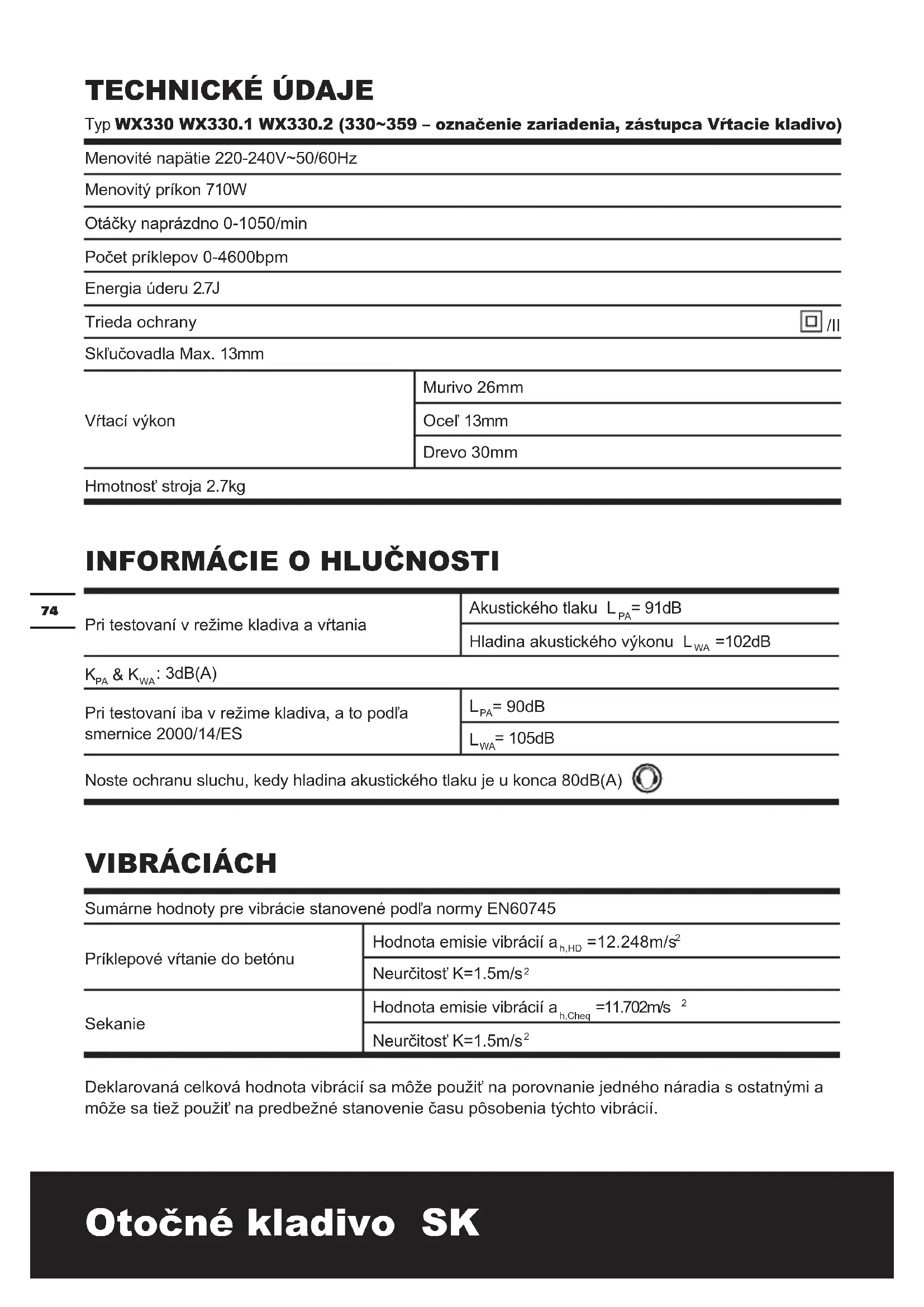 Štandardná dodávka neobsahuje všetko zobrazené, či popísané príslušenstvo.74 Otočné kladivo SK TECHNICKÉ ÚDAJE Typ WX330 WX330.1 WX330.2 (330~359 – označenie zariadenia, zástupca Vŕtacie kladivo) Menovité napätie 220-240V~50/60Hz Menovitý príkon 710W Otáčky naprázdno 0-1050/min Počet príklepov 0-4600bpm Energia úderu 2.7J Trieda ochrany /II Skľučovadla Max. 13mm Vŕtací výkon Murivo 26mm Oceľ 13mm Drevo 30mm Hmotnosť stroja 2.7kg