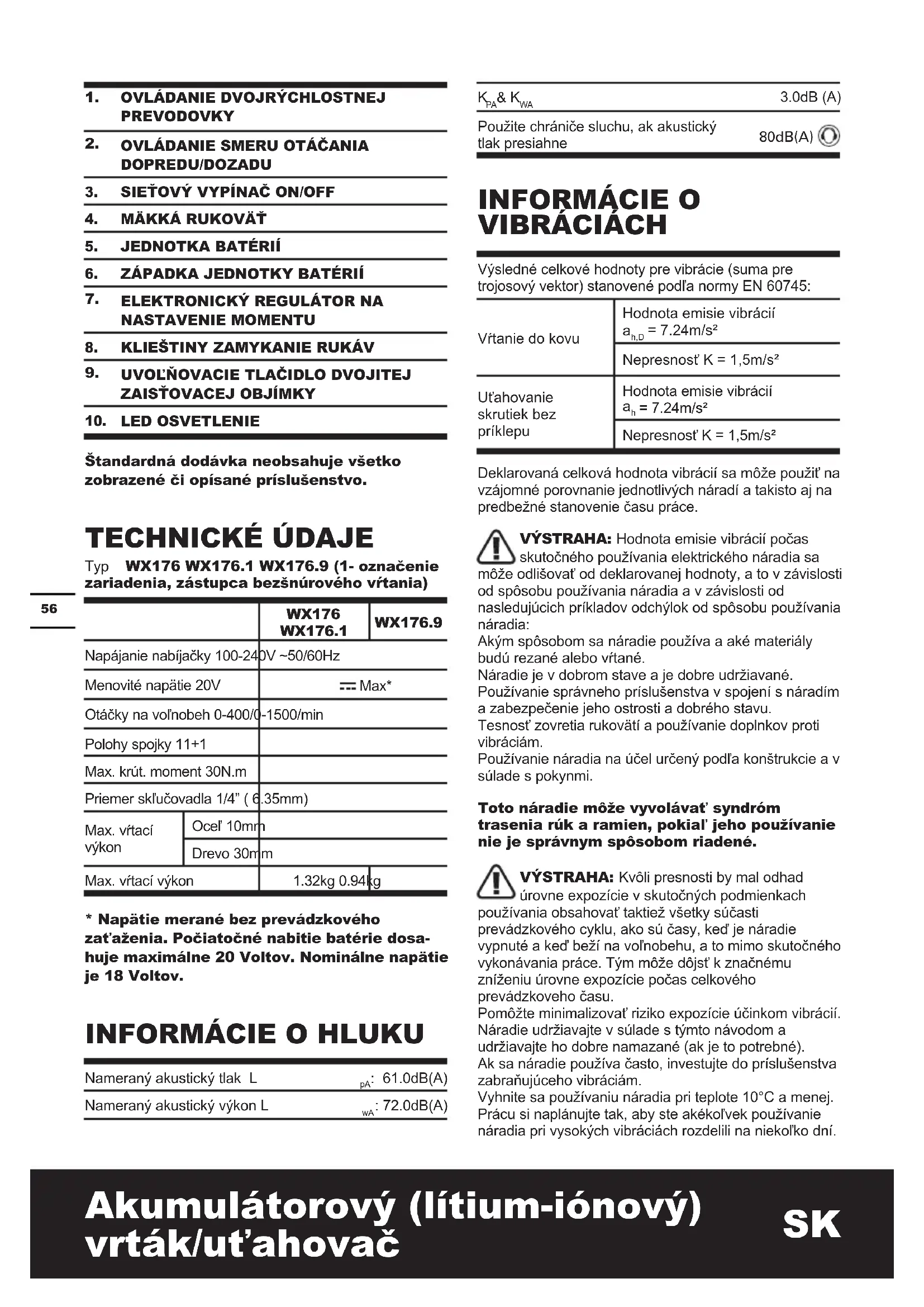 Vždy postupujte podľa uvedených pokynov a používajte správny postup nabíjania. j) Nenechávajte batériu nabíjať, ak nebude batéria použitá. k) Po dlhodobom uložení budete možno musieť vykonať niekoľko cyklov nabíjania a vybíjania, aby batéria dosiahla svoj maximálny výkon. l) Batéria poskytuje najvyšší výkon, ak sa používa pri bežnej izbovej teplote (20°C ± 5°C). m) Pri likvidácii batérií oddeľte od seba batérie s odlišnými elektrochemickými systémami. n) Vykonávajte nabíjanie iba v nabíjačke, ktorá je špecikovaná spoločnosťou WORX. Nepoužívajte inú nabíjačku, než je nabíjačka špeciálne dodaná na použitie s týmto zariadením. Nabíjačka, ktorá je vhodná pre jeden typ batérie, môže pri použití iného typu batérie vytvárať riziko spôsobenia požiaru. o) Nepoužívajte žiadnu batériu, ktorá nie je určená na použitie s týmto zariadením. p) Ukladajte batérie mimo dosahu detí. q) Uschovajte originálnu dokumentáciu k tomuto výrobku na budúce odkazy. r) Ak sa zariadenie nepoužíva, vyberte z neho batériu. s) Vykonávajte riadnu likvidáciu batérie.58 Akumulátorový (lítium-iónový) vrták/uťahovač