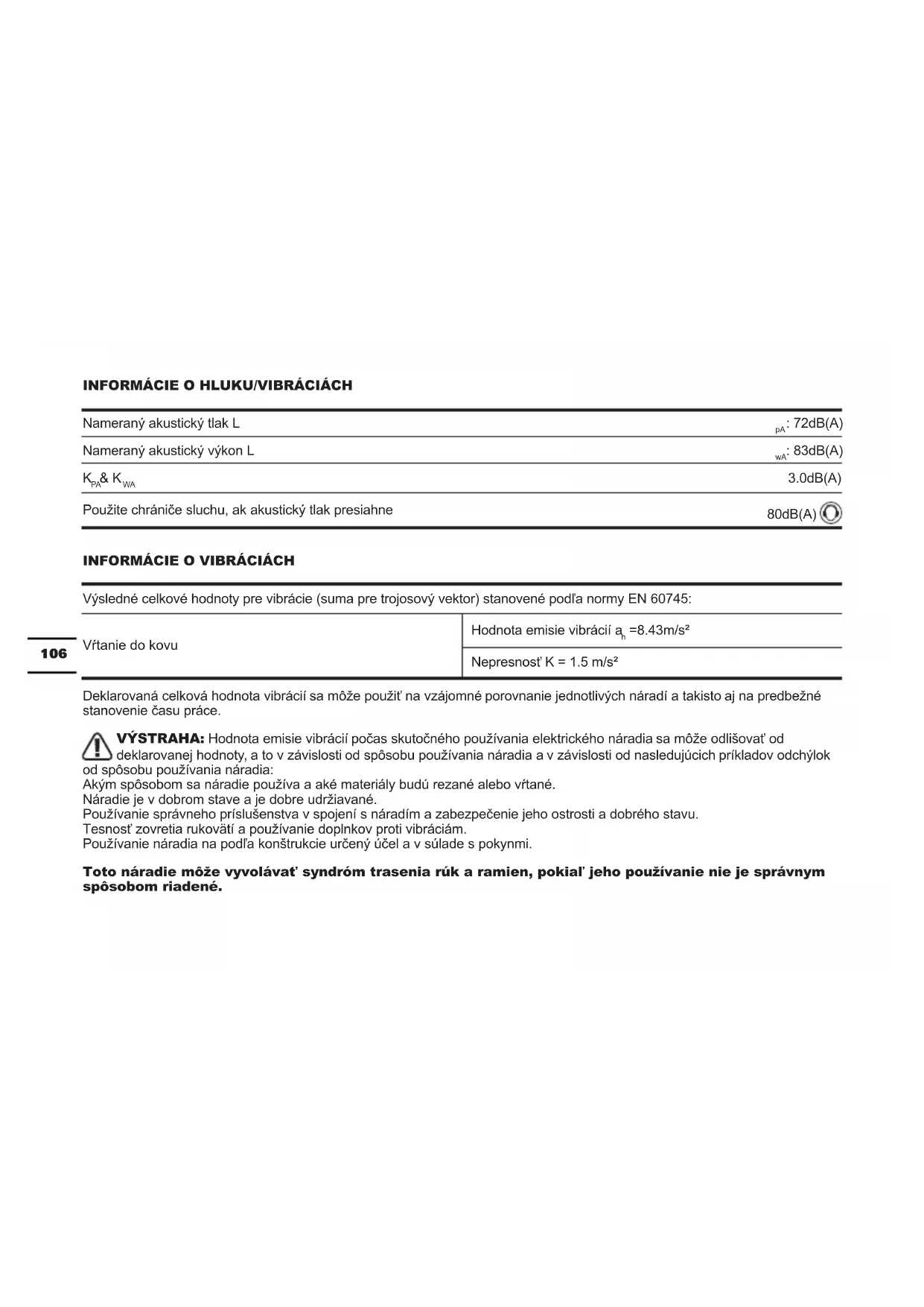 =8.43m/s² Nepresnosť K = 1.5 m/s² Deklarovaná celková hodnota vibrácií sa môže použiť na vzájomné porovnanie jednotlivých náradí a takisto aj na predbežné stanovenie času práce. VÝSTRAHA: Hodnota emisie vibrácií počas skutočného používania elektrického náradia sa môže odlišovať od deklarovanej hodnoty, a to v závislosti od spôsobu používania náradia a v závislosti od nasledujúcich príkladov odchýlok od spôsobu používania náradia: Akým spôsobom sa náradie používa a aké materiály budú rezané alebo vŕtané. Náradie je v dobrom stave a je dobre udržiavané. Používanie správneho príslušenstva v spojení s náradím a zabezpečenie jeho ostrosti a dobrého stavu. Tesnosť zovretia rukovätí a používanie doplnkov proti vibráciám. Používanie náradia na podľa konštrukcie určený účel a v súlade s pokynmi. Toto náradie môže vyvolávať syndróm trasenia rúk a ramien, pokiaľ jeho používanie nie je správnym spôsobom riadené.107 VÝSTRAHA: Kvôli presnosti by mal odhad úrovne expozície v skutočných podmienkach používania obsahovať tiež všetky súčasti prevádzkového cyklu, ako sú doby, počas ktorých je náradie vypnuté a počas ktorých beží na voľnobehu, a to mimo skutočného vykonávania práce. Tým môže dôjsť k značnému zníženiu úrovne expozície počas celkového prevádzkového času. Pomôžte minimalizovať riziko expozície účinkom vibrácií. VŽDY používajte ostré sekáče a čepele. Náradie udržiavajte v súlade s týmto návodom a udržiavajte ho dobre namazané (ak je to potrebné). Ak sa náradie používa často, investujte do príslušenstva zabraňujúceho vibráciám. Vyhnite sa používaniu náradia pri teplote 10°C a menej. Prácu si naplánujte tak, aby ste akékoľvek používanie náradia pri vysokých vibráciách rozdelili na niekoľko dní.