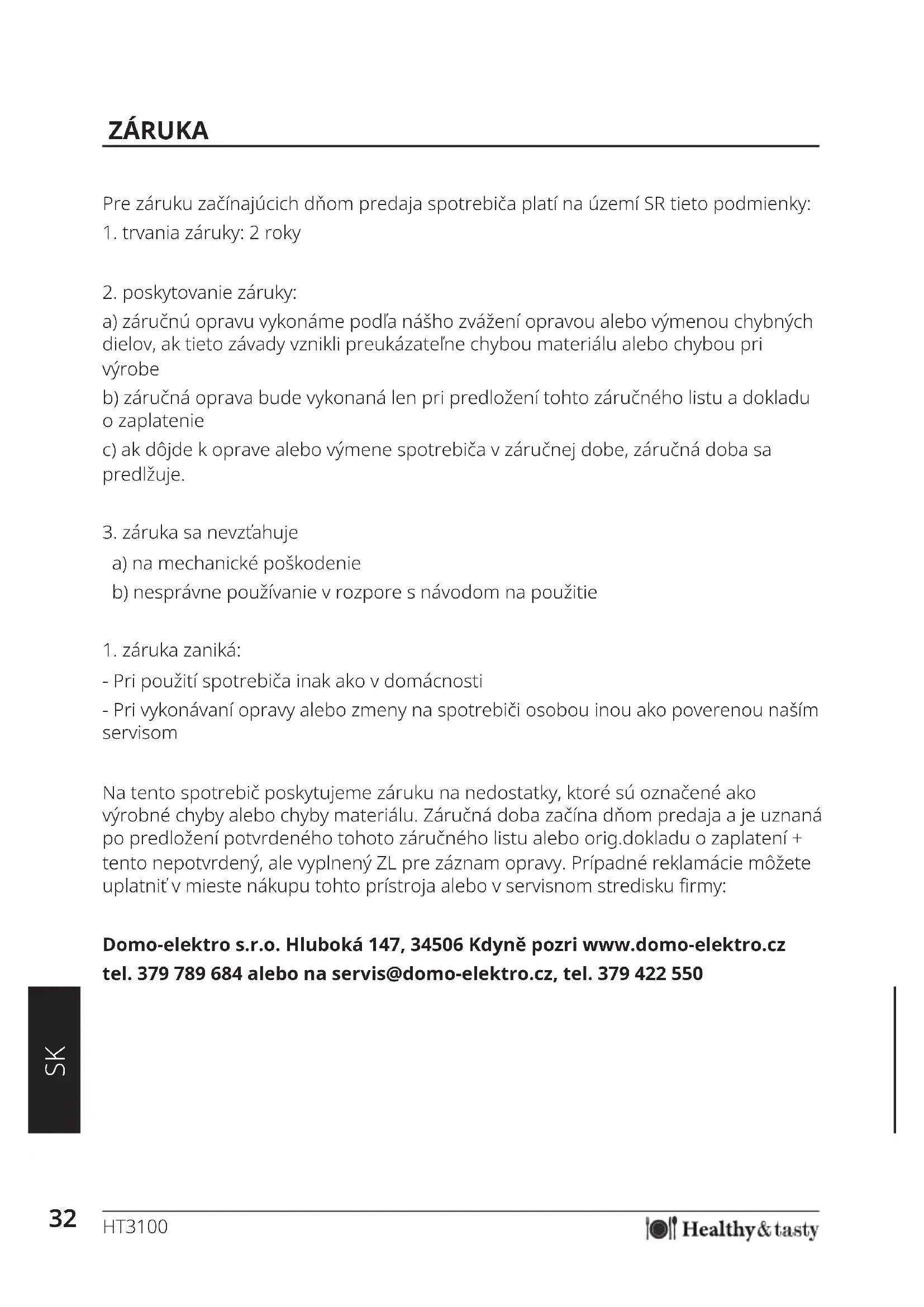 Na tento spotrebič poskytujeme záruku na nedostaty, ktoré su označené ako vyrobné chyby alebo chyby materialu. Záručná doba začina dnoj predaja a je uznaná po predloženi potvrdeného tohoto záručného listu alebo orig.dokladu o zaplateni + tento nepotvrdený, ale vyplnený ZL pre záznam opravy. Prípadné reklamácie možete uplatnit v mieste nákupu tohto prístroja alebo v servisnom stredisku firmy: