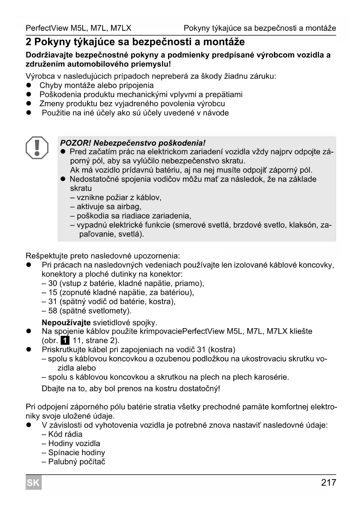 Rešpektujte preto nasledovné upozornenia: Pri prácach na nasledovných vedeniach používajte len izolované káblové koncovky, konektory a ploché dutinky na konektor: – 30 (vstup z batérie, kladné napätie, priamo), – 15 (zopnuté kladné napätie, za batériou), – 31 (spätný vodič od batérie, kostra), – 58 (spätné svetlomety). Nepoužívajte svietidlové spojky. Na spojenie káblov použite krimpovaciePerfectView M5L, M7L, M7LX kliešte (obr. 1 11, strane 2). Priskrutkujte kábel pri zapojeniach na vodič 31 (kostra) – spolu s káblovou koncovkou a ozubenou podložkou na ukostrovaciu skrutku vo- zidla alebo – spolu s káblovou koncovkou a skrutkou na plech na plech karosérie. Dbajte na to, aby bol prenos na kostru dostatočný! Pri odpojení záporného pólu batérie stratia všetky prechodné pamäte komfortnej elektro- niky svoje uložené údaje. V závislosti od vyhotovenia vozidla je potrebné znova nastaviť nasledovné údaje: – Kód rádia – Hodiny vozidla – Spínacie hodiny – Palubný počítač POZOR! Nebezpečenstvo poškodenia! Pred začatím prác na elektrickom zariadení vozidla vždy najprv odpojte zá- porný pól, aby sa vylúčilo nebezpečenstvo skratu. Ak má vozidlo prídavnú batériu, aj na nej musíte odpojiť záporný pól. Nedostatočné spojenia vodičov môžu mať za následok, že na základe skratu – vznikne požiar z káblov, – aktivuje sa airbag, – poškodia sa riadiace zariadenia, – vypadnú elektrické funkcie (smerové svetlá, brzdové svetlo, klaksón, za- paľovanie, svetlá).Pokyny týkajúce sa bezpečnosti a montáže PerfectView M5L, M7L, M7LX