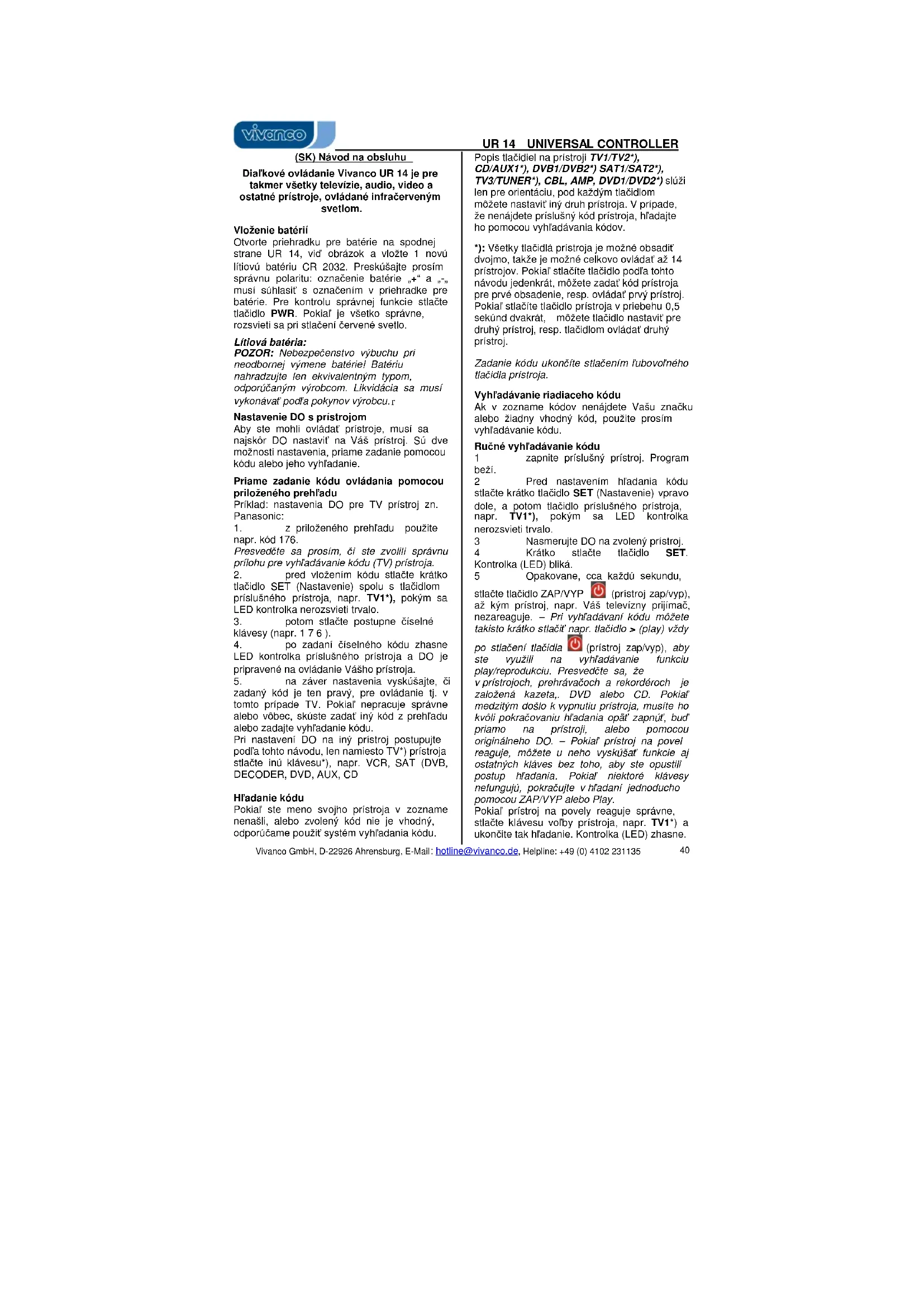(SK) Návod na obsluhu Dia`kové ovládanie Vivanco UR 14 je pre takmer všetky televízie, audio, video a ostatné prístroje, ovládané infraerveným svetlom.