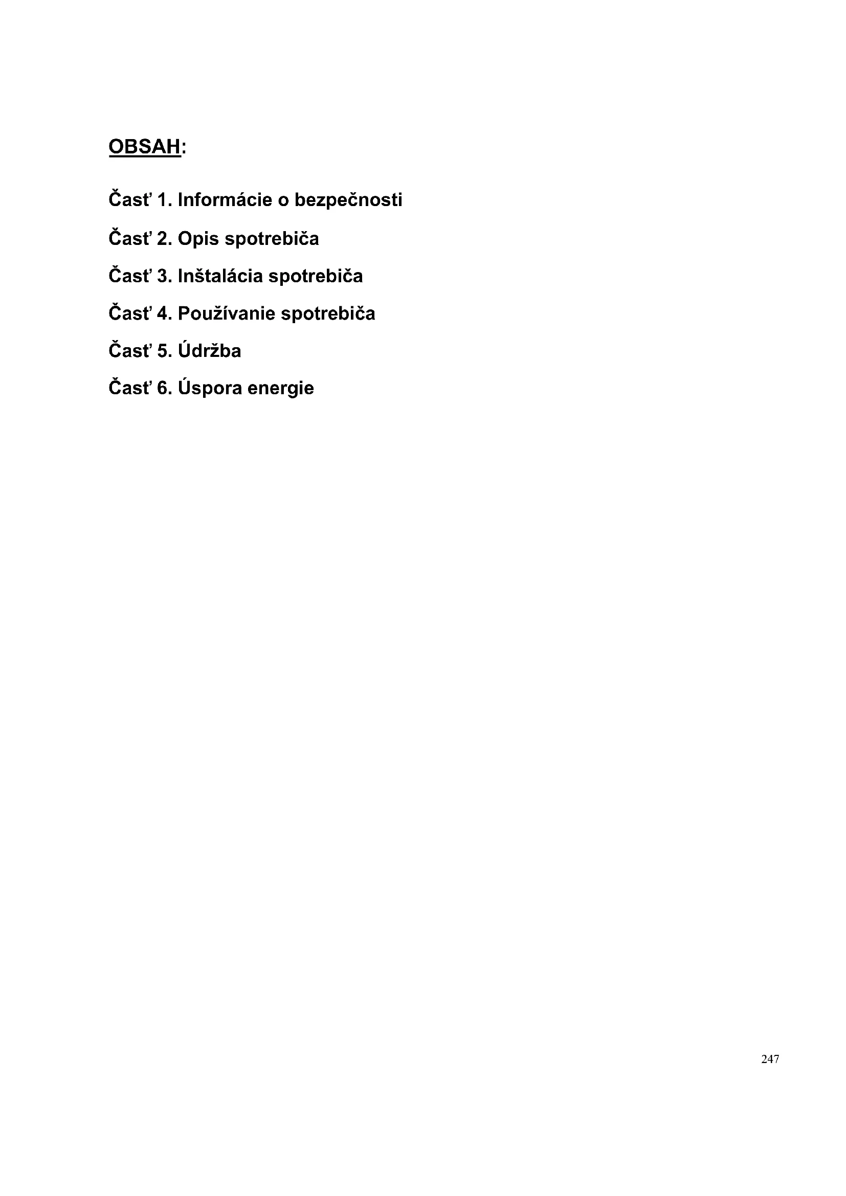 Ta aparat je označen v skladu z Direktivo št. 2012/19/EU Evropskega parlamenta in Sveta o odpadni električni in elektronski opremi (OEEO). OEEO vsebuje tako okolju škodljive snovi (ki lahko povzročijo negativne posledice za okolje) kot osnovne komponente (ki jih je mogoče ponovno uporabiti). Posebna obdelava za OEEO je nujna, da se odstranijo in ustrezno odlagajo vsa onesnaževala ter predelajo in reciklirajo vsi materiali. Posamezniki imajo lahko pomembno vlogo pri preprečevanju, da bi OEEO postala okoljska težava. Nujno je treba upoštevati nekatera temeljna pravila. OEEO se ne sme obravnavati kot gospodinjske odpadke. OEEO je treba predati ustreznim zbirnim mestom, ki jih upravlja občina ali registrirana podjetja. V mnogih državah je zaradi velikih količin OEEO lahko zagotovljen domači odvoz. V številnih državah lahko ob nakupu novega aparata starega oddate prodajalcu, ki ga je dolžan brezplačno prevzeti po načelu eden za enega, če je nova oprema enake vrste in ima enake funkcije kot stara. Skladnost Oznaka na izdelku potrjuje skladnost z vsemi ustreznimi evropskimi zahtevami s področja varnosti, zdravja in okolja, ki se v zakonodaji uporabljajo za ta izdelek.247 OBSAH: Časť 1. Informácie o bezpečnosti Časť 2. Opis spotrebiča Časť 3. Inštalácia spotrebiča Časť 4. Používanie spotrebiča Časť 5. Údržba Časť 6. Úspora energie248 Ďakujeme za zakúpenie tohto produktu. Pred začatím používania chladničky si dôkladne prečítajte tento návod na obsluhu, ktorý vám pomôže využiť výkon spotrebiča v plnej miere. Všetku dokumentáciu odložte, aby bola k dispozícii na budúce použitie alebo pre ďalších vlastníkov. Tento produkt je určený výlučne na použitie v domácnosti alebo na podobné účely, ako napríklad: - kuchynské priestory pre personál v obchodoch, úradoch a iných pracovných prostrediach, - na farmách, pre hostí ubytovaných v hoteloch, moteloch a iných obytných zariadeniach, - v zariadeniach ponúkajúcich nocľah s raňajkami, - na poskytovanie stravovacích služieb a služieb podobného charakteru, ktoré nie sú určené na maloobchodný predaj. Tento spotrebič sa smie používať výlučne na uskladňovanie potravín. Akékoľvek iné použitie sa považuje za nebezpečné a výrobca neponesie zodpovednosť za žiadne zanedbania. Zároveň odporúčame dobre sa oboznámiť so záručnými podmienkami. V záujme zaistenia najlepšieho možného výkonu a bezchybnej prevádzky spotrebiča je veľmi dôležité, aby ste si dôkladne prečítali tieto pokyny. Nedodržanie týchto pokynov môže viesť k zamietnutiu nároku na bezplatný servis počas záručnej doby.249 Časť 1. Informácie o bezpečnosti Tento návod obsahuje mnoho dôležitých bezpečnostných informácií. Tieto pokyny odporúčame uložiť na bezpečnom mieste, aby slúžili ako zdroj informácií na uľahčenie a zefektívnenie používania spotrebiča. Chladnička obsahuje plynné chladivo (R600a: izobután) a izolačný plyn (cyklopentán), ktoré predstavujú veľmi nízku záťaž pre životné prostredie, sú však horľavé. Upozornenie: riziko vzniku požiaru V prípade poškodenia chladiaceho okruhu: Eliminujte otvorené plamene a zdroje vznietenia. Dôkladne vyvetrajte miestnosť, v ktorej sa spotrebič nachádza. centuáln doba chodu:od 11 min., zastav. 20 min.5 ℃: VÝSTRAHA! Počas čistenia/prenášania spotrebiča bezpodmienečne dávajte pozor, aby ste sa nedotkli kovových vodičov kondenzátora v zadnej časti spotrebiča, pretože môže dôjsť k poraneniu prstov a rúk, prípadne k poškodeniu produktu.