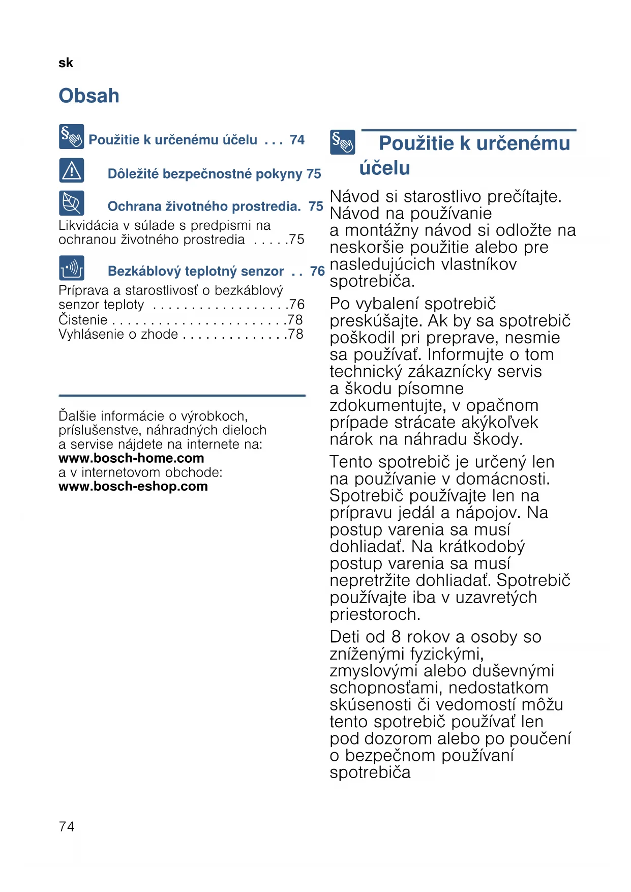 - Obsah skNávod na používanie 8 Použitie k určenému účelu p. 74