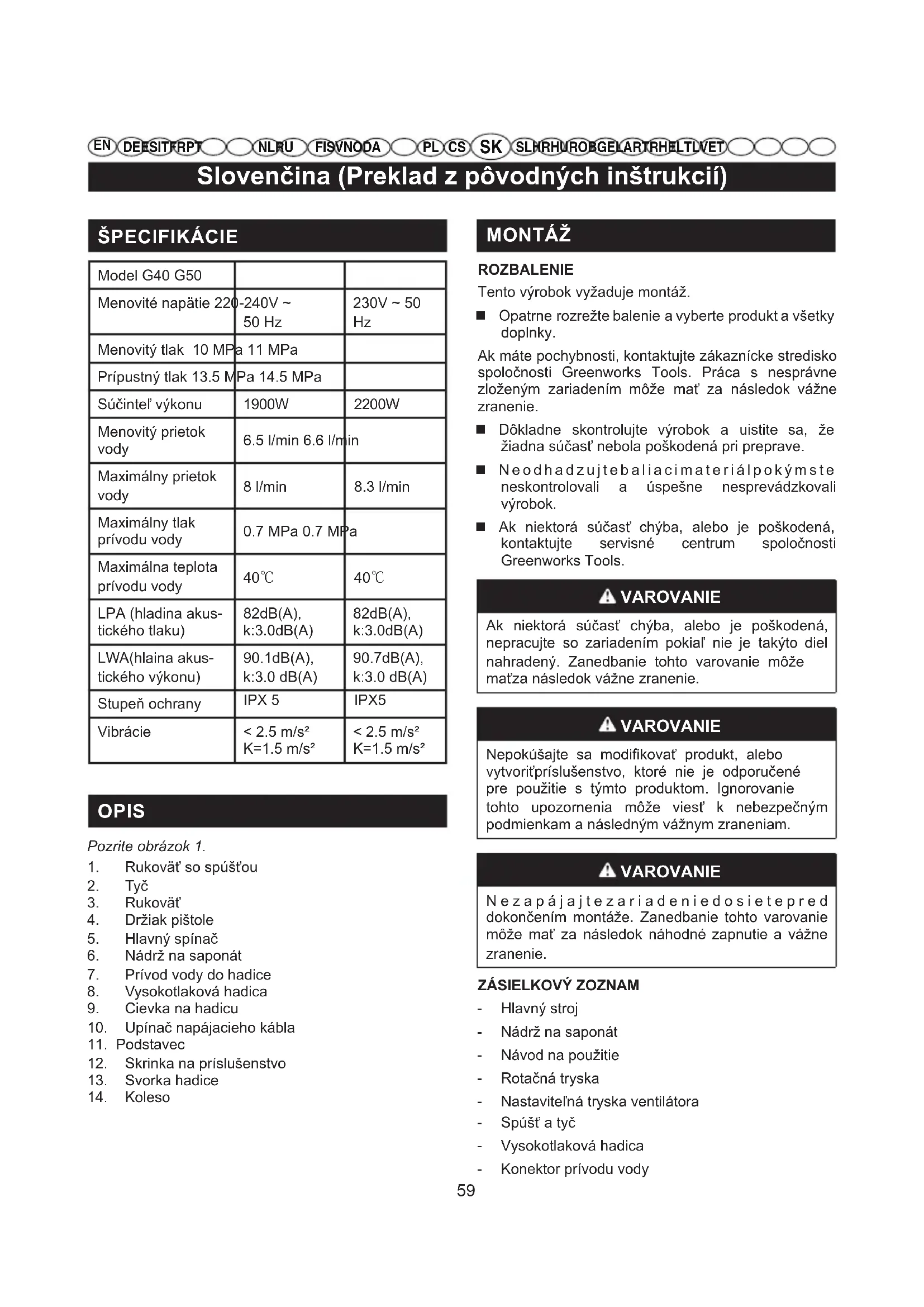 G50 - Vysokotlakový čistič GREENWORKS - Bezplatný návod na obsluhu