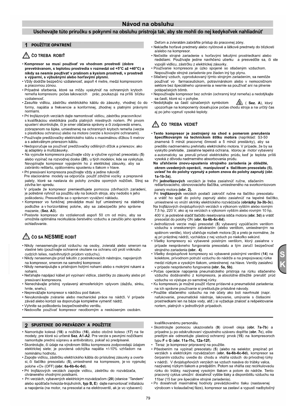 - Nevykonávajte zváranie alebo mechanické práce na nádrži. V prípade závad alebo korózií sa doporučuje kompletne vymeniť nádrž.• Vyhnite sa poškodeniu bezpečnostného ventilu.• Nedovoľte používať kompresor neodborným a neskúseným osobám. Deťom a zvieratám zabráňte prístup do pracovnej zóny.• Neklaďte horľavé predmety alebo nylónové a látkové predmety do blízkosti a/alebo na kompresor.• Nečistite strojné zariadenie s horľavými tekutými prostriedkami alebo riedidlami. Používajte jedine navlhčenú utierku a presvedčte sa, či ste vypojili vidlicu, zástrčku z elektrickej zásuvky.• Používanie kompresora je úzko spojené so stlačeným vzduchom. Nepoužívajte strojné zariadenie pre žiaden iný typ plynu.• Stlačený vzduch, vyprodukovaný týmto strojným zariadením, sa nemôže používať vo farmaceutickom, potravinárskom alebo v nemocničnom sektore bez špeciálneho upravenia a nesmie sa používať ani na plnenie potápačských bômb.• Nepoužívajte kompresor bez ochrán (ochranný kryt remeňa) a nedotýkajte sa častí, ktoré sú v pohybe. • Nedotýkajte sa častí označených symbolom (Sez. A), ktorý upozorňuje na komponenty dosahujúce počas chodu stroja a na určitý čas aj po jeho vypnutí vysoké teploty.