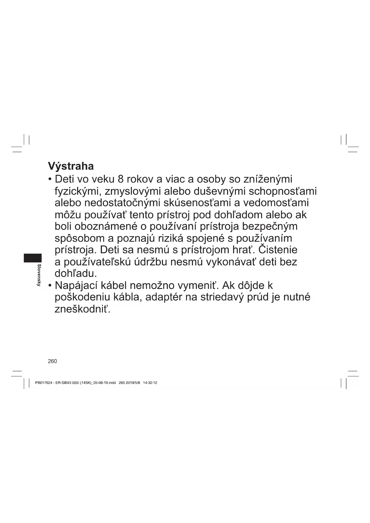- Napájací kábel nemožno vymeniť. Ak dôjde k poškodeniu kábla, adaptér na striedavý prúd je nutné zneškodniť. PB017624 - ER-GB43 (14SK)_05-08-19.indd 260 2019/5/8 14:32:12261 Slovensky