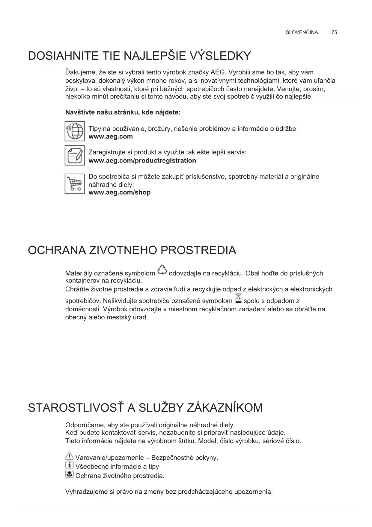 Materiály označené symbolom odovzdajte na recykláciu. Obal hoęte do príslušných kontajnerov na recykláciu. ChráĨte životné prostredie a zdravie ľudí a recyklujte odpad z elektrických a elektronických spotrebičov. Nelikvidujte spotrebiče označené symbolom spolu s odpadom z domácnosti. Výrobok odovzdajte v miestnom recyklačnom zariadení alebo sa obráĴte na obecný alebo mestský úrad. STAROSTLIVOSij A SLUŽBY ZÁKAZNÍKOM Odporúčame, aby ste používali originálne náhradné diely. Keę budete kontaktovaĴ servis, nezabudnite si pripraviĴ nasledujúce údaje. Tieto informácie nájdete na výrobnom štítku. Model, číslo výrobku, sériové číslo. Varovanie/upozornenie – Bezpečnostné pokyny. Všeobecné informácie a tipy Ochrana životného prostredia. Vyhradzujeme si právo na zmeny bez predchádzajúceho upozornenia. SK NÁVOD NA POUŽÍVANIEwww.aeg.com
