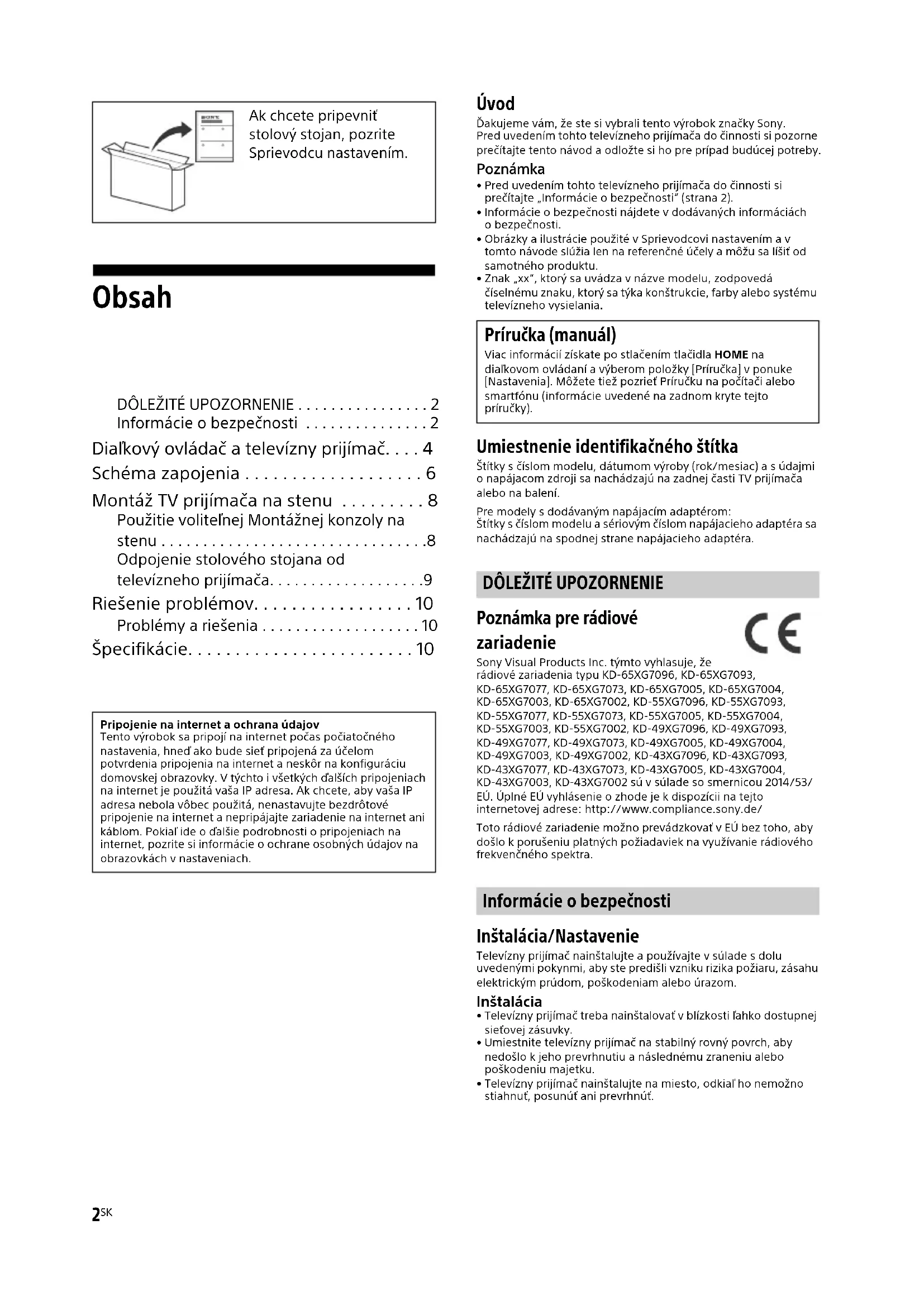 Poznámka pre rádiové zariadenie Sony Visual Products Inc. týmto vyhlasuje, že rádiové zariadenia typu KD-65XG7096, KD-65XG7093, KD-65XG7077, KD-65XG7073, KD-65XG7005, KD-65XG7004, KD-65XG7003, KD-65XG7002, KD-55XG7096, KD-55XG7093, KD-55XG7077, KD-55XG7073, KD-55XG7005, KD-55XG7004, KD-55XG7003, KD-55XG7002, KD-49XG7096, KD-49XG7093, KD-49XG7077, KD-49XG7073, KD-49XG7005, KD-49XG7004, KD-49XG7003, KD-49XG7002, KD-43XG7096, KD-43XG7093, KD-43XG7077, KD-43XG7073, KD-43XG7005, KD-43XG7004, KD-43XG7003, KD-43XG7002 sú v súlade so smernicou 2014/53/EÚ. Úplné EÚ vyhlásenie o zhode je k dispozícii na tejto internetovej adrese: http://www.compliance.sony.de/Toto rádiové zariadenie možno prevádzkovať v EÚ bez toho, aby došlo k porušeniu platných požiadaviek na využívanie rádiového frekvenčného spektra. Informácie o bezpečnosti Inštalácia/Nastavenie Televízny prijímač nainštalujte a používajte v súlade s dolu uvedenými pokynmi, aby ste predišli vzniku rizika požiaru, zásahu elektrickým prúdom, poškodeniam alebo úrazom. Inštalácia