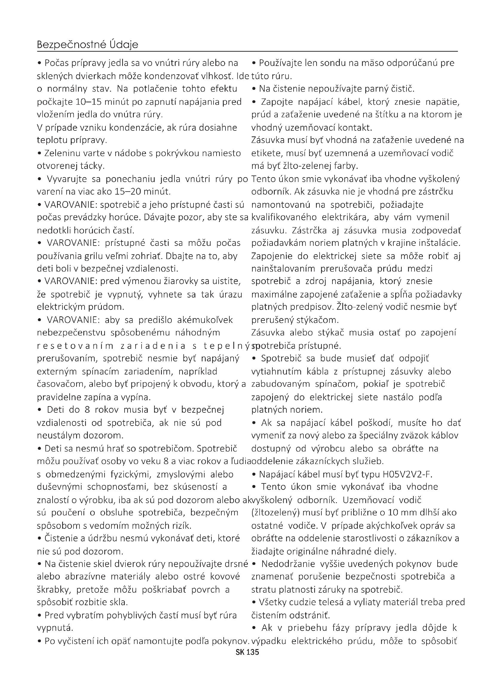 - Ak v priebehu fázy prípravy jedla dôjde k výpadku elektrického prúdu, môže to spôsobiť SK 135poruchu monitora. V takom prípade kontaktujte zákaznícke služby.