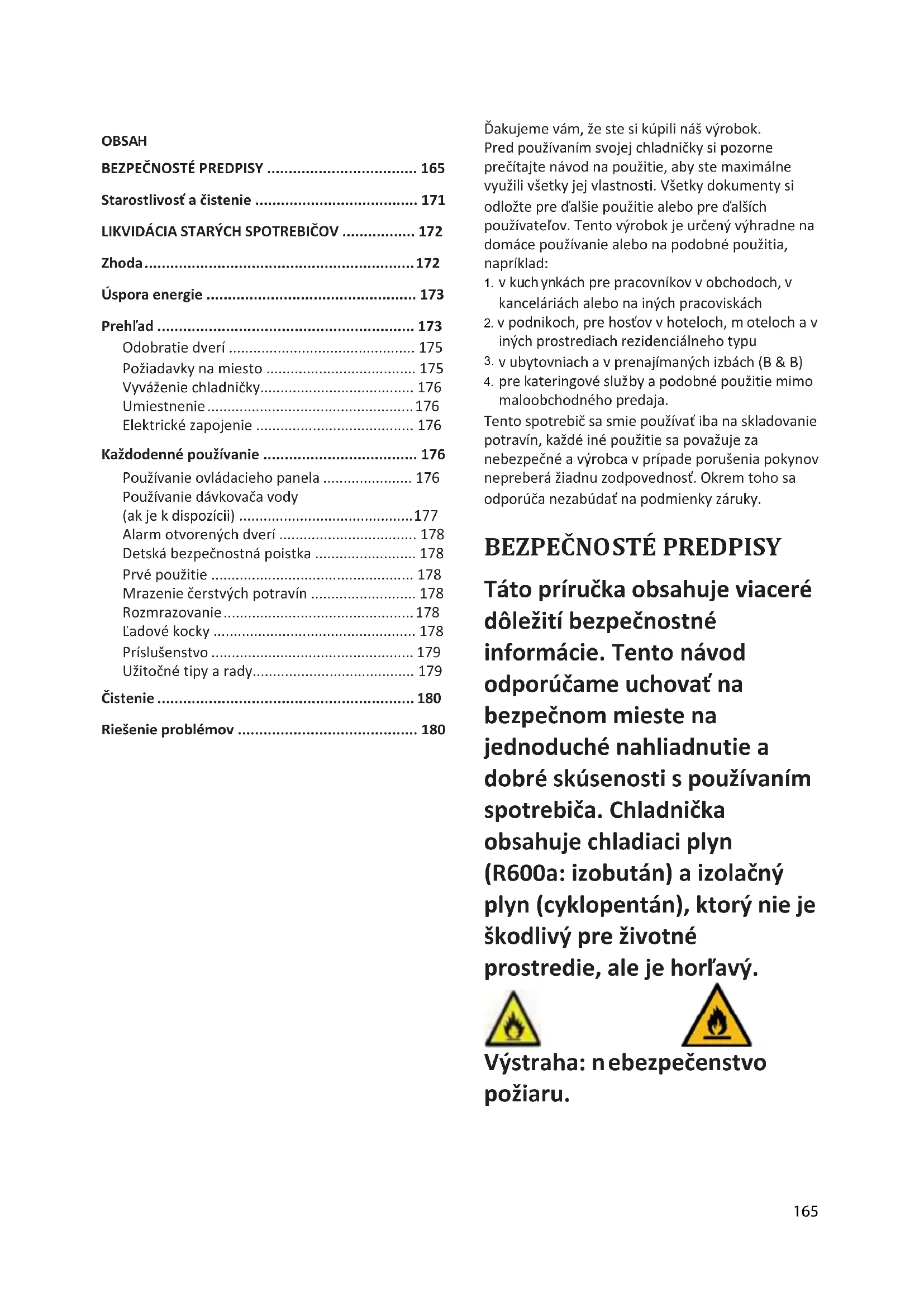 - za prostostoječi aparat: „ta hladilni aparat ni namenjen za uporabo kot vgradni aparat“; na z adnej strane spotrebiča (zadný panel alebo kompresor). Ide o symbol upozornenia na nebezpečenstvo požiaru. V chladiacom potrubí a kompresore sa nachádzajú horľavé materiály. Počas používania, obsluhy a likvidácie ponechávajte mimo zdrojov požiaru.spotrebiča prístupná.
