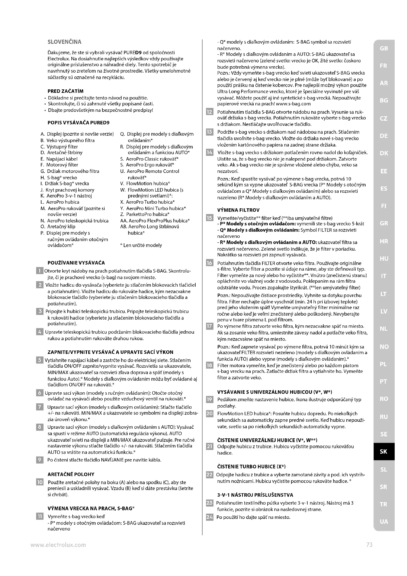 UASLOVENČINA Ďakujeme, že ste si vybrali vysávač PURED9 od spoločnosti Electrolux. Na dosiahnutie najlepších výsledkov vždy používajte originálne príslušenstvo a náhradné diely. Tento spotrebič je navrhnutý so zreteľom na životné prostredie. Všetky umelohmotné súčiastky sú označené na recykláciu.
