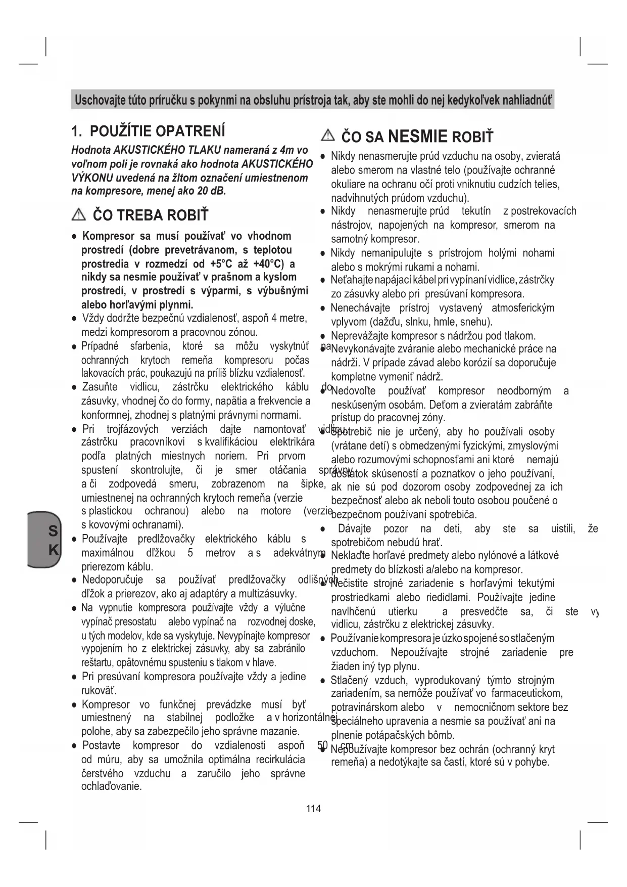● Nikdynenasmerujteprúdvzduchunaosoby,zvieratá alebosmeromnavlastnételo(používajteochranné okuliarenaochranuočíprotivniknutiucudzíchtelies, nadvihnutýchprúdomvzduchu). ● Nikdy nenasmerujteprúd tekutín zpostrekovacích nástrojov, napojených na kompresor, smerom na samotnýkompresor. ● Nikdy nemanipulujte s prístrojom holými nohami alebosmokrýmirukamianohami. ● Neťahajtenapájacíkábelprivypínanívidlice,zástrčky zozásuvkyalebopripresúvaníkompresora. ● Nenechávajte prístroj vystavený atmosferickým vplyvom(dažďu,slnku,hmle,snehu). ● Neprevážajtekompresorsnádržoupodtlakom. ● Nevykonávajtezváraniealebomechanicképrácena nádrži.Vprípadezávadalebokoróziísadoporučuje kompletnevymeniťnádrž. ● Nedovoľte používať kompresor neodborným a neskúsenýmosobám.Deťomazvieratámzabráňte prístupdopracovnejzóny. ● Spotrebič nie je určený, aby ho používali osoby (vrátanedetí)sobmedzenýmifyzickými,zmyslovými aleborozumovýmischopnosťamianiktoré nemajú dostatokskúsenostíapoznatkovojehopoužívaní, ak nie sú pod dozorom osoby zodpovednej za ich bezpečnosťaleboaknebolitoutoosoboupoučenéo bezpečnompoužívaníspotrebiča. ● Dávajte pozor na deti, aby ste sa uistili, že saso spotrebičomnebudúhrať. ● Neklaďtehorľavépredmetyalebonylónovéalátkové predmetydoblízkostia/alebonakompresor. ● Nečistite strojné zariadenie s horľavými tekutými prostriedkami alebo riedidlami. Používajte jedine navlhčenú utierku a presvedčte sa, či ste vypojili vidlicu,zástrčkuzelektrickejzásuvky. ● Používaniekompresorajeúzkospojenésostlačeným vzduchom. Nepoužívajte strojné zariadenie pre žiadeninýtypplynu. ● Stlačený vzduch, vyprodukovaný týmto strojným zariadením,sanemôžepoužívaťvofarmaceutickom, potravinárskomalebo v nemocničnomsektorebez špeciálnehoupraveniaanesmiesapoužívaťanina plneniepotápačskýchbômb. ● Nepoužívajtekompresorbezochrán(ochrannýkryt remeňa)anedotýkajtesačastí,ktorésúvpohybe.115
