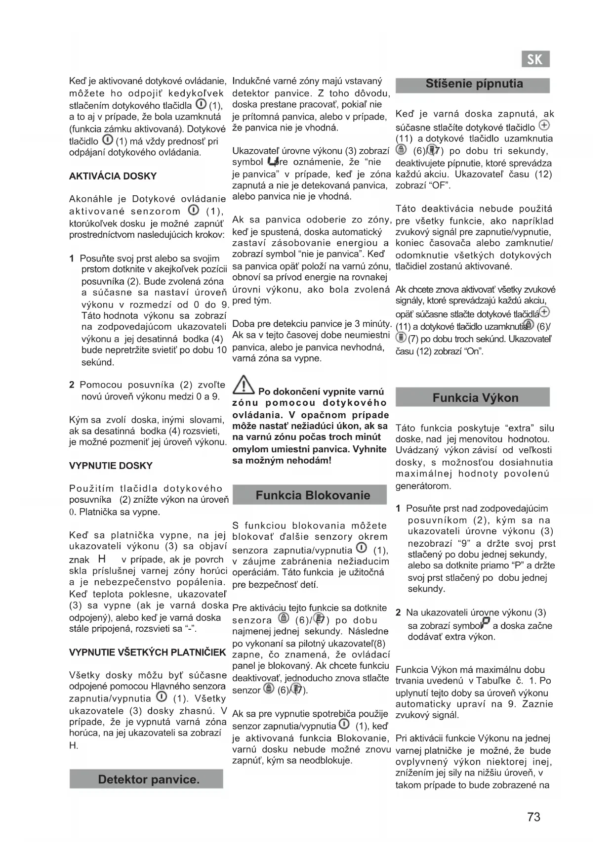 Detektor panvice. Indukčné varné zóny majú vstavaný detektor panvice. Z toho dôvodu, doska prestane pracovať, pokiaľ nie je prítomná panvica, alebo v prípade, že panvica nie je vhodná. Ukazovateľ úrovne výkonu (3) zobrazí symbol pre oznámenie, že “nie je panvica” v prípade, keď je zóna zapnutá a nie je detekovaná panvica, alebo panvica nie je vhodná. Ak sa panvica odoberie zo zóny, keď je spustená, doska automatický zastaví zásobovanie energiou a zobrazí symbol “nie je panvica”. Keď sa panvica opäť položí na varnú zónu, obnoví sa prívod energie na rovnakej úrovni výkonu, ako bola zvolená pred tým. Doba pre detekciu panvice je 3 minúty. Ak sa v tejto časovej dobe neumiestni panvica, alebo je panvica nevhodná, varná zóna sa vypne. Po dokončení vypnite varnú zónu pomocou dotykového ovládania. V opačnom prípade môže nastať nežiadúci úkon, ak sa na varnú zónu počas troch minút omylom umiestni panvica. Vyhnite sa možným nehodám! Funkcia Blokovanie S funkciou blokovania môžete blokovať ďalšie senzory okrem senzora zapnutia/vypnutia (1), v záujme zabránenia nežiaducim operáciám. Táto funkcia je užitočná pre bezpečnosť detí. Pre aktiváciu tejto funkcie sa dotknite senzora (6)/ (7) po dobu najmenej jednej sekundy. Následne po vykonaní sa pilotný ukazovateľ(8) zapne, čo znamená, že ovládací panel je blokovaný. Ak chcete funkciu deaktivovať, jednoducho znova stlačte senzor (6)/ (7). Ak sa pre vypnutie spotrebiča použije senzor zapnutia/vypnutia (1), keď je aktivovaná funkcia Blokovanie, varnú dosku nebude možné znovu zapnúť, kým sa neodblokuje. Stíšenie pípnutia Keď je varná doska zapnutá, ak súčasne stlačíte dotykové tlačidlo (11) a dotykové tlačidlo uzamknutia (6)/ (7) po dobu tri sekundy, deaktivujete pípnutie, ktoré sprevádza každú akciu. Ukazovateľ času (12) zobrazí “OF”. Táto deaktivácia nebude použitá pre všetky funkcie, ako napríklad zvukový signál pre zapnutie/vypnutie, koniec časovača alebo zamknutie/ odomknutie všetkých dotykových tlačidiel zostanú aktivované. Ak chcete znova aktivovať všetky zvukové signály, ktoré sprevádzajú každú akciu, opäť súčasne stlačte dotykové tlačidlá (11) a dotykové tlačidlo uzamknutia (6)/ (7) po dobu troch sekúnd. Ukazovateľ času (12) zobrazí “On”. Funkcia Výkon Táto funkcia poskytuje “extra” silu doske, nad jej menovitou hodnotou. Uvádzaný výkon závisí od veľkosti dosky, s možnosťou dosiahnutia maximálnej hodnoty povolenú generátorom. 1 Posuňte prst nad zodpovedajúcim posuvníkom (2), kým sa na ukazovateli úrovne výkonu (3) nezobrazí “9” a držte svoj prst stlačený po dobu jednej sekundy, alebo sa dotknite priamo “P” a držte svoj prst stlačený po dobu jednej sekundy. 2 Na ukazovateli úrovne výkonu (3) sa zobrazí symbol a doska začne dodávať extra výkon. Funkcia Výkon má maximálnu dobu trvania uvedenú v Tabuľke č. 1. Po uplynutí tejto doby sa úroveň výkonu automaticky upraví na 9. Zaznie zvukový signál. Pri aktivácii funkcie Výkonu na jednej varnej platničke je možné, že bude ovplyvnený výkon niektorej inej, znížením jej sily na nižšiu úroveň, v takom prípade to bude zobrazené naSK