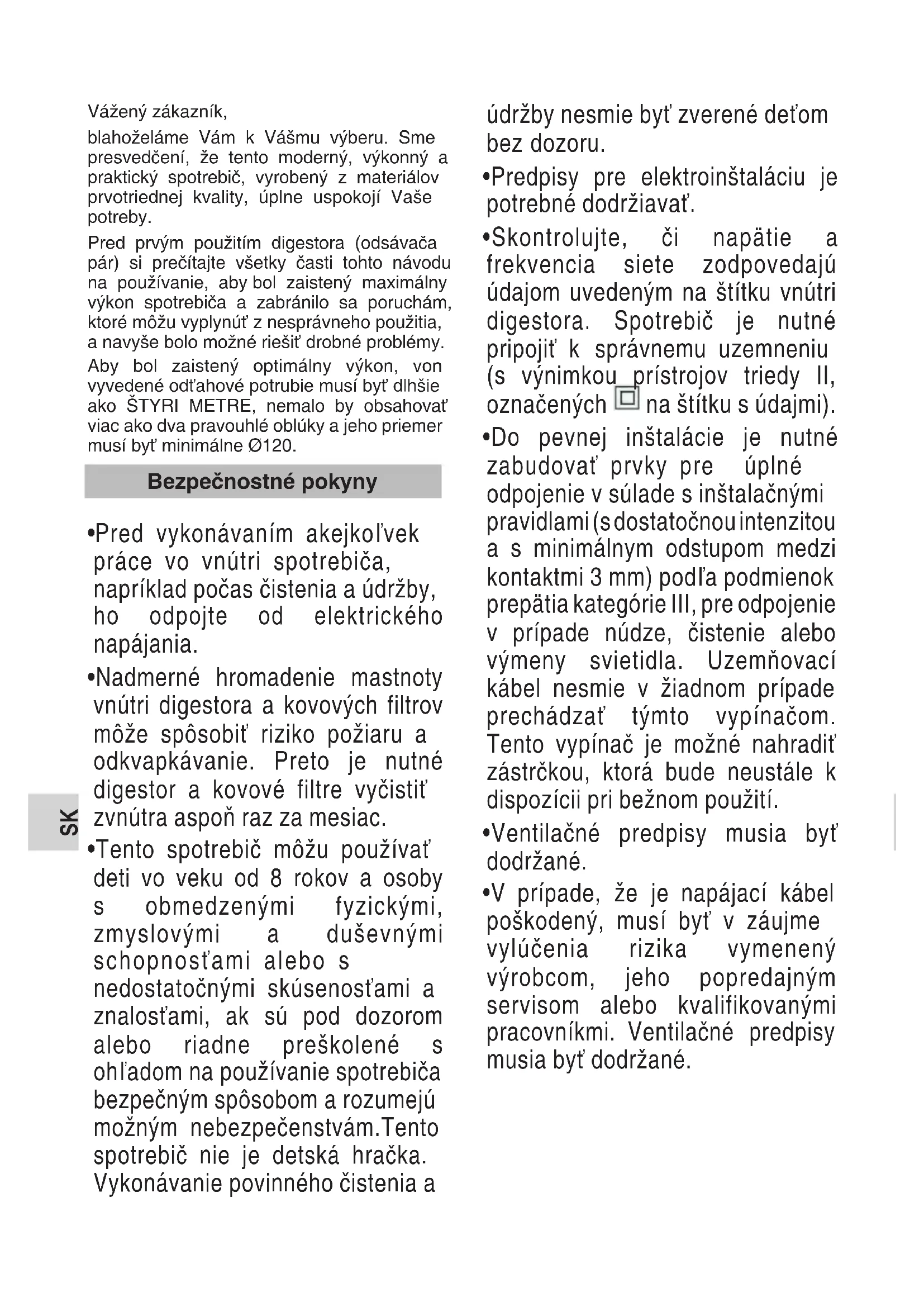 - Можливо, при встановленні вугільних фільтрів може спостерігатися зменшення потоку витяжки в витяжці. Вугільні фільтри (Додаткові)SK Vážený zákazník, blahoželáme Vám k Vášmu výberu. Sme presvedčení, že tento moderný, výkonný a praktický spotrebič, vyrobený z materiálov prvotriednej kvality, úplne uspokojí Vaše potreby. Pred prvým použitím digestora (odsávača pár) si prečítajte všetky časti tohto návodu na používanie, aby bol zaistený maximálny výkon spotrebiča a zabránilo sa poruchám, ktoré môžu vyplynúť z nesprávneho použitia, a navyše bolo možné riešiť drobné problémy. Aby bol zaistený optimálny výkon, von vyvedené odťahové potrubie musí byť dlhšie ako ŠTYRI METRE, nemalo by obsahovať viac ako dva pravouhlé oblúky a jeho priemer musí byť minimálne Ø120.