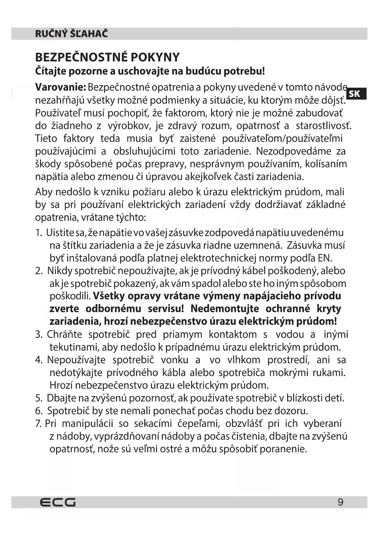 Baliaci papier avlnitá lepenka – odovzdajte do zberných surovín. Prebalová fólia, PE vrecká, plastové diely – vyhadzujte do kontajnerov na plasty. LIKVIDÁCIA VÝROBKU PO SKONČENÍ ŽIVOTNOSTI Likvidácia použitých elektrických aelektronických zariadení (platí včlenských krajinách EÚ aďalších európskych krajinách so zavedeným systémom triedenia odpadu) Vyobrazený symbol na produkte alebo na obale znamená, že s produktom by sa nemalo nakladať ako s domovým odpadom. Produkt odovzdajte na miesto určené na recykláciu elektrických a elektronických zariadení. Správnou likvidáciou produktu zabránite negatívnym vplyvom na ľudské zdravie a životné prostredie. Recyklácia materiálov prispieva kochrane prírodných zdrojov. Viac informácií orecyklácii tohto produktu vám poskytne obecný úrad, organizácia na spracovanie domového odpadu alebo predajné miesto, kde ste produkt kúpili. Tento výrobok spĺňa požiadavky smerníc EÚ o elektromagnetickej kompatibilite a elektrickej bezpečnosti. Návod na obsluhu je k dispozícii na webových stránkach www.ecg-electro.eu. Zmena textu a technických parametrov vyhradená.
