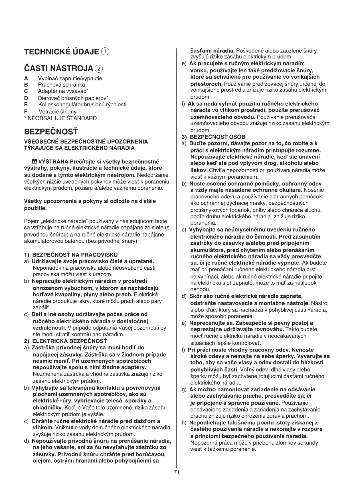 a) Zástrčka prívodnej šnúry sa musí hodiť do napájacej zásuvky. Zástrčka sa v žiadnom prípade nesmie meniť. Pri uzemnených spotrebičoch nepoužívajte spolu s nimi žiadne adaptéry. Nezmenená zástrčka a vhodná zásuvka znižujú riziko zásahu elektrickým prúdom. b) Vyhýbajte sa telesnému kontaktu s povrchovými plochami uzemnených spotrebičov, ako sú elektrické rúry, vyhrievacie telesá, sporáky a chladničky. Keď je Vaše telo uzemnené, riziko zásahu elektrickým prúdom je vyššie. c) Chráňte ručné elektrické náradie pred dažďom a vlhkom. Vniknutie vody do ručného elektrického náradia zvyšuje riziko zásahu elektrickým prúdom. d) Nepoužívajte prívodnú šnúru na prenášanie náradia, na jeho vešanie, ani za ňu nevyťahujte zástrčku zo zásuvky. Prívodnú šnúru chráňte pred horúčavou, olejom, ostrými hranami alebo pohybujúcimi sa72 škodlivý (styk alebo nadýchanie prachu môže spôsobiť alergické reakcie a/alebo respiračné ochorenia obsluhy a okolostojacich osôb); používajte ochrannú masku tváre a pracujte so zariadením na odsávanie prachu, ak je takéto zariadenie možné pripojiť
