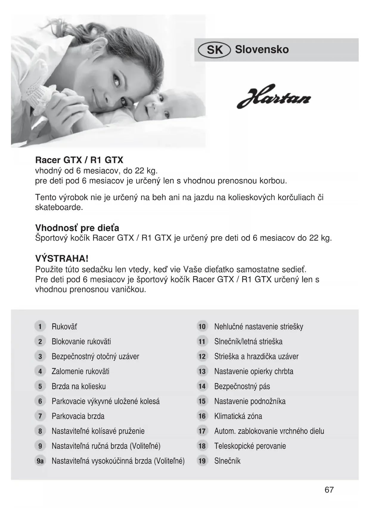 Racer GTX / R1 GTX vhodný od 6 mesiacov, do 22 kg. pre deti pod 6 mesiacov je určený len s vhodnou prenosnou korbou. Tento výrobok nie je určený na beh ani na jazdu na kolieskových korčuliach či skateboarde. Rukoväť Blokovanie rukoväti Bezpečnostný otočný uzáver Zalomenie rukoväti Brzda na koliesku Parkovacie výkyvné uložené kolesá Parkovacia brzda Nastaviteľné kolísavé pruženie Nastaviteľná ručná brzda (Voliteľné) Nastaviteľná vysokoúčinná brzda (Voliteľné) Nehlučné nastavenie striešky Slnečník/letná strieška Strieška a hrazdička uzáver Nastavenie opierky chrbta Bezpečnostný pás Nastavenie podnožníka Klimatická zóna Autom. zablokovanie vrchného dielu Teleskopické perovanie Slnečník