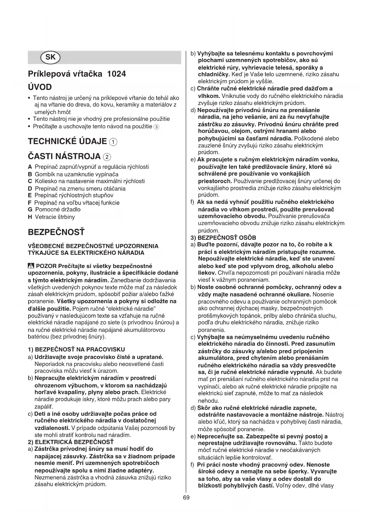 d) Nepoužívané ručné elektrické náradie uschovávajte mimo dosahu detí. Nedopust'te, aby ručné elektrické náradie používali osoby, ktoré s nim nie su dōkladne oboznámene, alebo ktoré si neprecítili tento Návod na používanie. Ak ručné elektrické náradie používajú neskúsené osoby, stavá sa nebezpečným nastrojom.