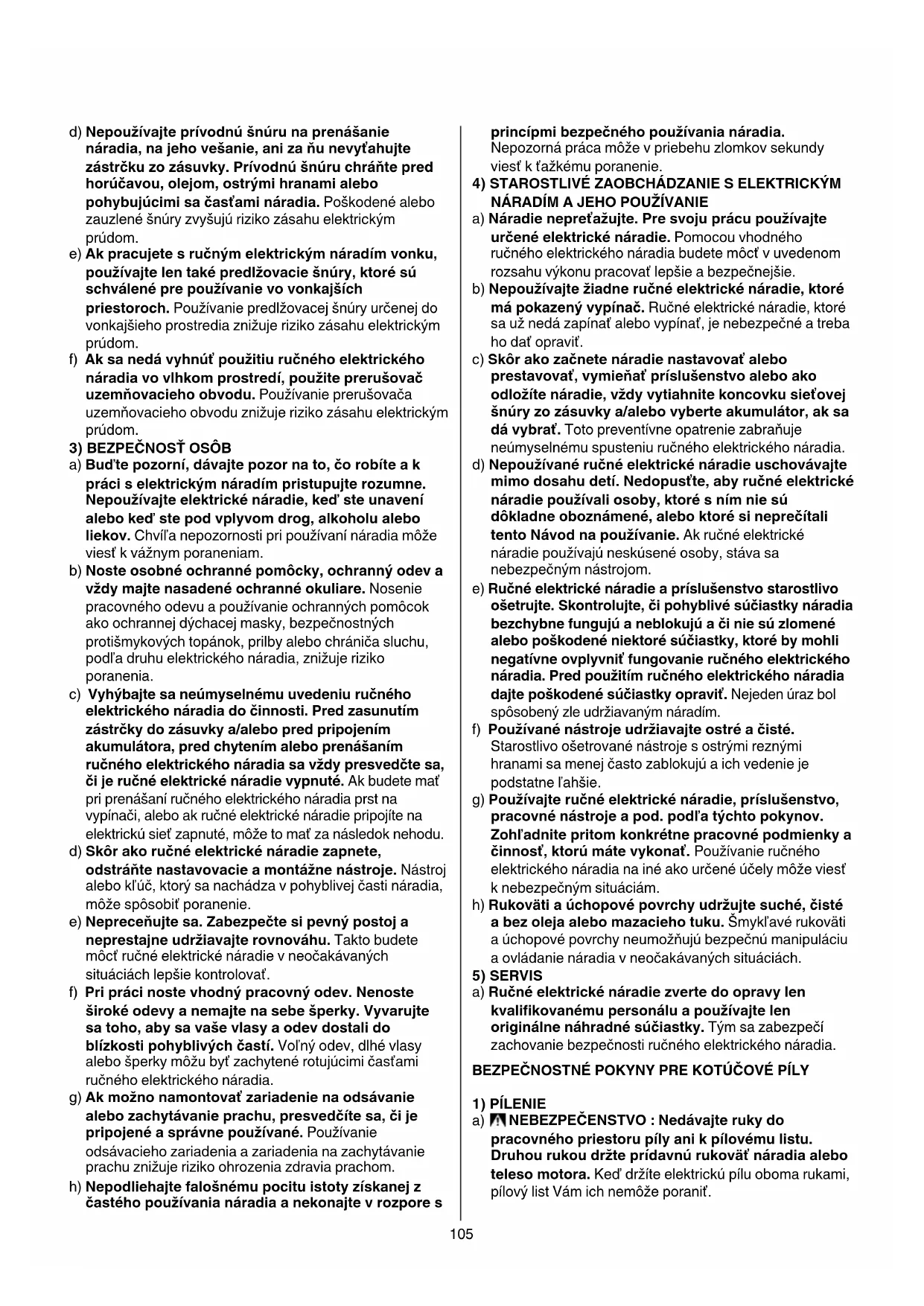 a) Buďte pozorní, dávajte pozor na to, čo robíte a k práci s elektrickým náradím pristupujte rozumne. Nepoužívajte elektrické náradie, keď ste unavení alebo keď ste pod vplyvom drog, alkoholu alebo liekov. Chvíľa nepozornosti pri používaní náradia môže viesť k vážnym poraneniam. b) Noste osobné ochranné pomôcky, ochranný odev a vždy majte nasadené ochranné okuliare. Nosenie pracovného odevu a používanie ochranných pomôcok ako ochrannej dýchacej masky, bezpečnostných protišmykových topánok, prilby alebo chrániča sluchu, podľa druhu elektrického náradia, znižuje riziko poranenia. c) Vyhýbajte sa neúmyselnému uvedeniu ručného elektrického náradia do činnosti. Pred zasunutím zástrčky do zásuvky a/alebo pred pripojením akumulátora, pred chytením alebo prenášaním ručného elektrického náradia sa vždy presvedčte sa, či je ručné elektrické náradie vypnuté. Ak budete mať pri prenášaní ručného elektrického náradia prst na vypínači, alebo ak ručné elektrické náradie pripojíte na elektrickú sieť zapnuté, môže to mať za následok nehodu. d) Skôr ako ručné elektrické náradie zapnete, odstráňte nastavovacie a montážne nástroje. Nástroj alebo kľúč, ktorý sa nachádza v pohyblivej časti náradia, môže spôsobiť poranenie. e) Nepreceňujte sa. Zabezpečte si pevný postoj a neprestajne udržiavajte rovnováhu. Takto budete môcť ručné elektrické náradie v neočakávaných situáciách lepšie kontrolovať. f) Pri práci noste vhodný pracovný odev. Nenoste široké odevy a nemajte na sebe šperky. Vyvarujte sa toho, aby sa vaše vlasy a odev dostali do blízkosti pohyblivých častí. Voľný odev, dlhé vlasy alebo šperky môžu byť zachytené rotujúcimi časťami ručného elektrického náradia. g) Ak možno namontovať zariadenie na odsávanie alebo zachytávanie prachu, presvedčíte sa, či je pripojené a správne používané. Používanie odsávacieho zariadenia a zariadenia na zachytávanie prachu znižuje riziko ohrozenia zdravia prachom. h) Nepodliehajte falošnému pocitu istoty získanej z častého používania náradia a nekonajte v rozpore s princípmi bezpečného používania náradia. Nepozorná práca môže v priebehu zlomkov sekundy viesť k ťažkému poranenie.