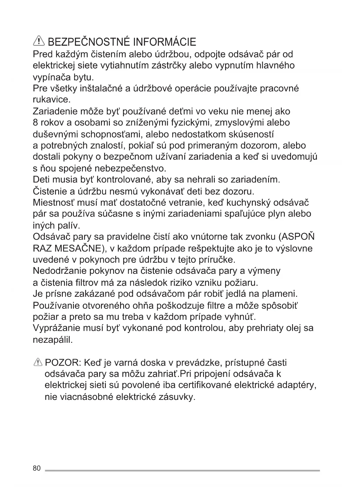 Predkaždýmčistenímaleboúdržbou,odpojteodsávačpárod elektrickejsietevytiahnutímzástrčkyalebovypnutímhlavného vypínačabytu. Prevšetkyinštalačnéaúdržbovéoperáciepoužívajtepracovné rukavice. Zariadeniemôžebyťpoužívanédeťmivovekuniemenejako 8rokovaosobamisozníženýmifyzickými,zmyslovýmialebo duševnýmischopnosťami,alebonedostatkomskúseností apotrebnýchznalostí,pokiaľsúpodprimeranýmdozorom,alebo dostalipokynyobezpečnomužívanízariadeniaakeďsiuvedomujú sňouspojenénebezpečenstvo. Detimusiabyťkontrolované,abysanehralisozariadením. Čistenieaúdržbunesmúvykonávaťdetibezdozoru. Miestnosťmusímaťdostatočnévetranie,keďkuchynskýodsávač pársapoužívasúčasnesinýmizariadeniamispaľujúceplynalebo inýchpalív. Odsávačparysapravidelnečistíakovnútornetakzvonku(ASPOŇ RAZMESAČNE),vkaždomprípaderešpektujteakojetovýslovne uvedenévpokynochpreúdržbuvtejtopríručke. Nedodržaniepokynovnačistenieodsávačaparyavýmeny ačistenialtrovmázanásledokrizikovznikupožiaru. Jeprísnezakázanépododsávačompárrobiťjedlánaplameni. Používanieotvorenéhoohňapoškodzujeltreamôžespôsobiť požiarapretosamutrebavkaždomprípadevyhnúť. Vyprážaniemusíbyťvykonanépodkontrolou,abyprehriatyolejsa nezapálil. POZOR:Keďjevarnádoskavprevádzke,prístupnéčasti odsávačaparysamôžuzahriať.Pripripojeníodsávačak elektrickejsietisúpovolenéibacertifikovanéelektrickéadaptéry, nieviacnásobnéelektrickézásuvky.81
