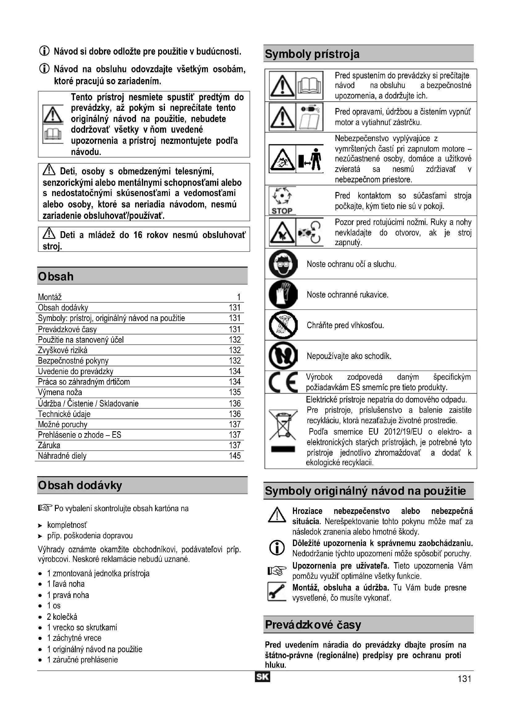 Var vänlig beakta bifogade garantivillkor.131 Návod si dobre odložte pre použitie v budúcnosti. Návod na obsluhu odovzdajte všetkým osobám, ktoré pracujú so zariadením. Tento prístroj nesmiete spustiť predtým do prevádzky, až pokým si neprečítate tento originálný návod na použitie, nebudete dodržovať všetky v ňom uvedené upozornenia a prístroj nezmontujete podľa návodu.