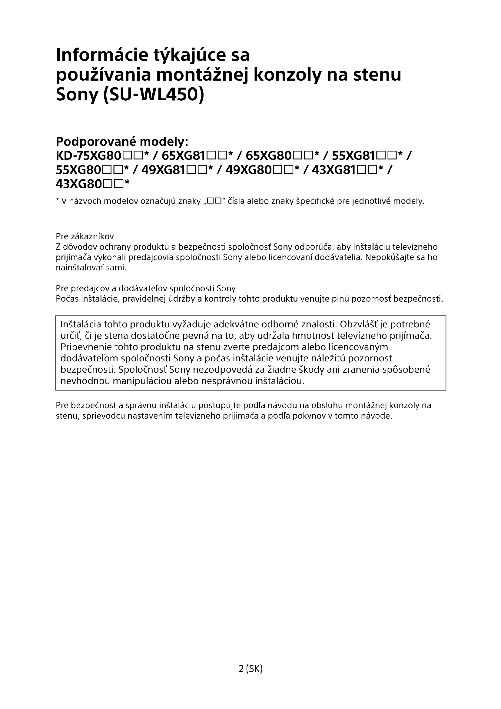 Z dovodov ochrany produktu a bezpečnosti spolocnost' Sony odporúca, aby instaláciu televízneho prijímača vykonali predajcovia spolocnosti Sony alebo licencovani dodávatelia. Nepokušajte sa ho nainstalovat sami.