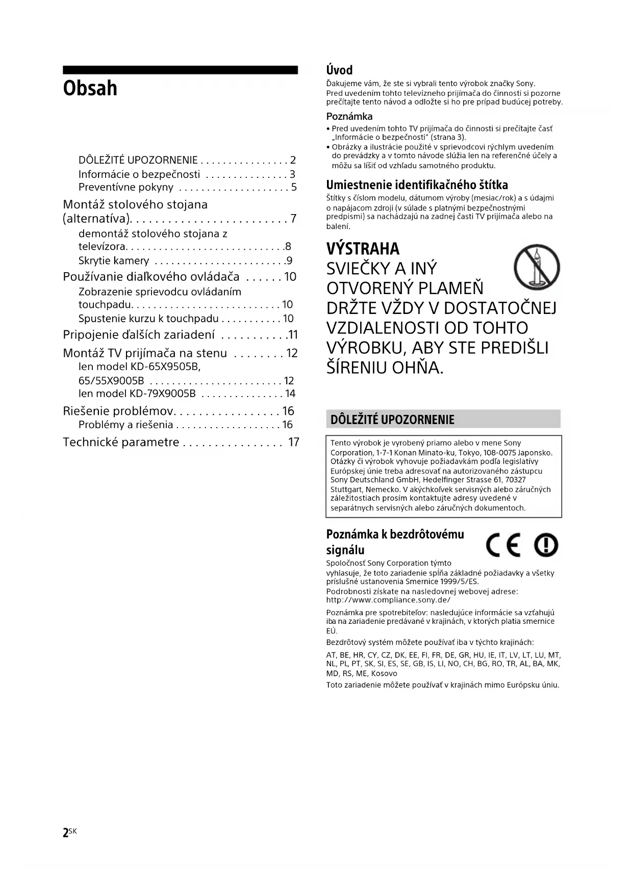 ŠÍRENIU OHŇA. Poznámka k bezdrôtovému signálu Spoločnosť Sony Corporation týmto vyhlasuje, že toto zariadenie spĺňa základné požiadavky a všetky príslušné ustanovenia Smernice 1999/5/ES.Podrobnosti získate na nasledovnej webovej adrese:http://www.compliance.sony.de/Poznámka pre spotrebiteľov: nasledujúce informácie sa vzťahujú a na zariadenie predávané v krajinách, v ktorých platia smernice EÚ. Bezdrôtový systém môžete používať iba v týchto krajinách:AT, BE, HR, CY, CZ, DK, EE, FI, FR, DE, GR, HU, IE, IT, LV, LT, LU, MT, NL, PL, PT, SK, SI, ES, SE, GB, IS, LI, NO, CH, BG, RO, TR, AL, BA, MK, MD, RS, ME, KosovoToto zariadenie môžete používať v krajinách mimo Európsku úniu.