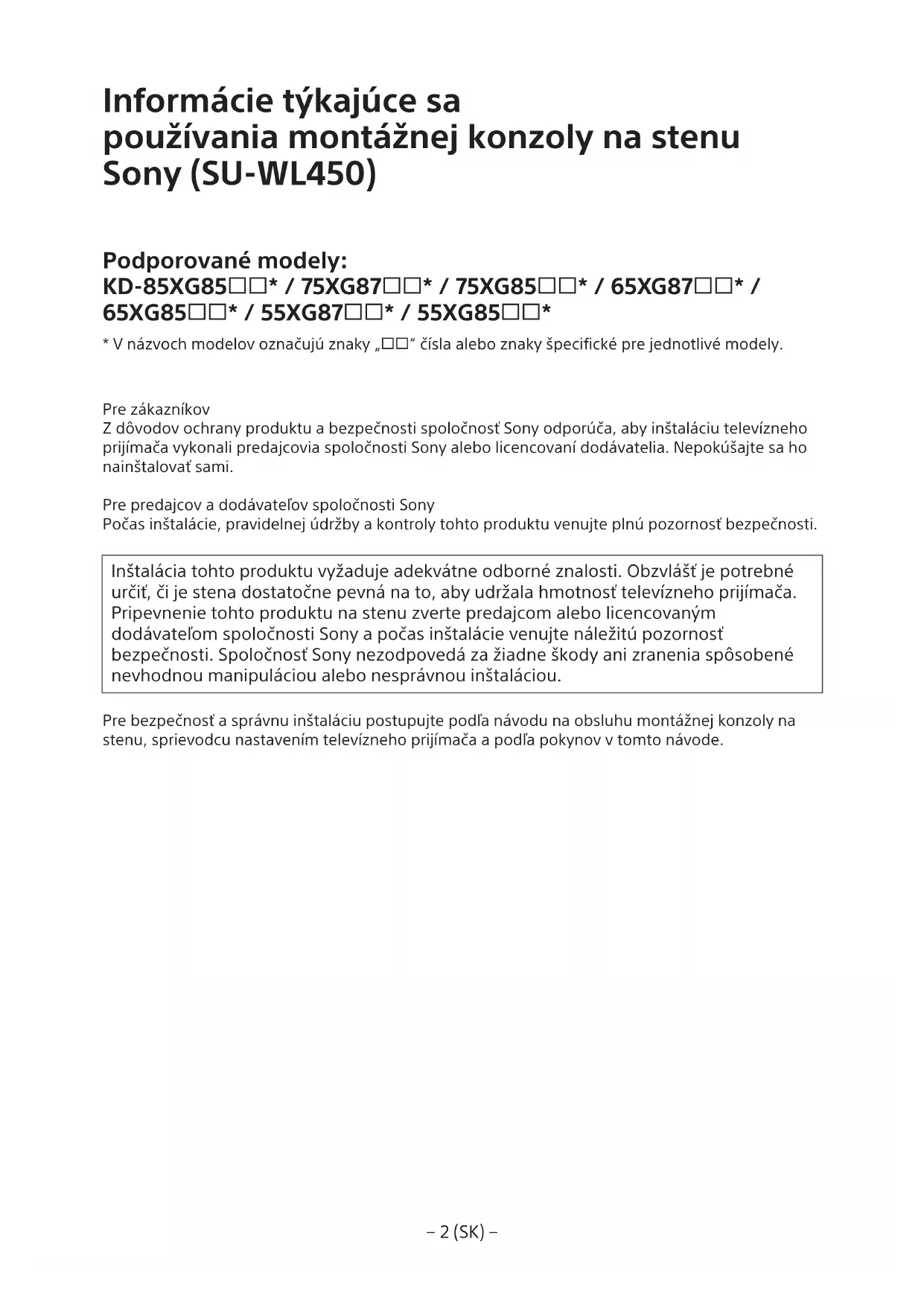 - V názvoch modelov označujú znaky „“ čísla alebo znaky špecifické pre jednotlivé modely. Pre zákazníkov Z dôvodov ochrany produktu a bezpečnosti spoločnosť Sony odporúča, aby inštaláciu televízneho prijímača vykonali predajcovia spoločnosti Sony alebo licencovaní dodávatelia. Nepokúšajte sa ho nainštalovať sami. Pre predajcov a dodávateľov spoločnosti Sony Počas inštalácie, pravidelnej údržby a kontroly tohto produktu venujte plnú pozornosť bezpečnosti. Inštalácia tohto produktu vyžaduje adekvátne odborné znalosti. Obzvlášť je potrebné určiť, či je stena dostatočne pevná na to, aby udržala hmotnosť televízneho prijímača. Pripevnenie tohto produktu na stenu zverte predajcom alebo licencovaným dodávateľom spoločnosti Sony a počas inštalácie venujte náležitú pozornosť bezpečnosti. Spoločnosť Sony nezodpovedá za žiadne škody ani zranenia spôsobené nevhodnou manipuláciou alebo nesprávnou inštaláciou. Pre bezpečnosť a správnu inštaláciu postupujte podľa návodu na obsluhu montážnej konzoly na stenu, sprievodcu nastavením televízneho prijímača a podľa pokynov v tomto návode.− 3 (SK) −