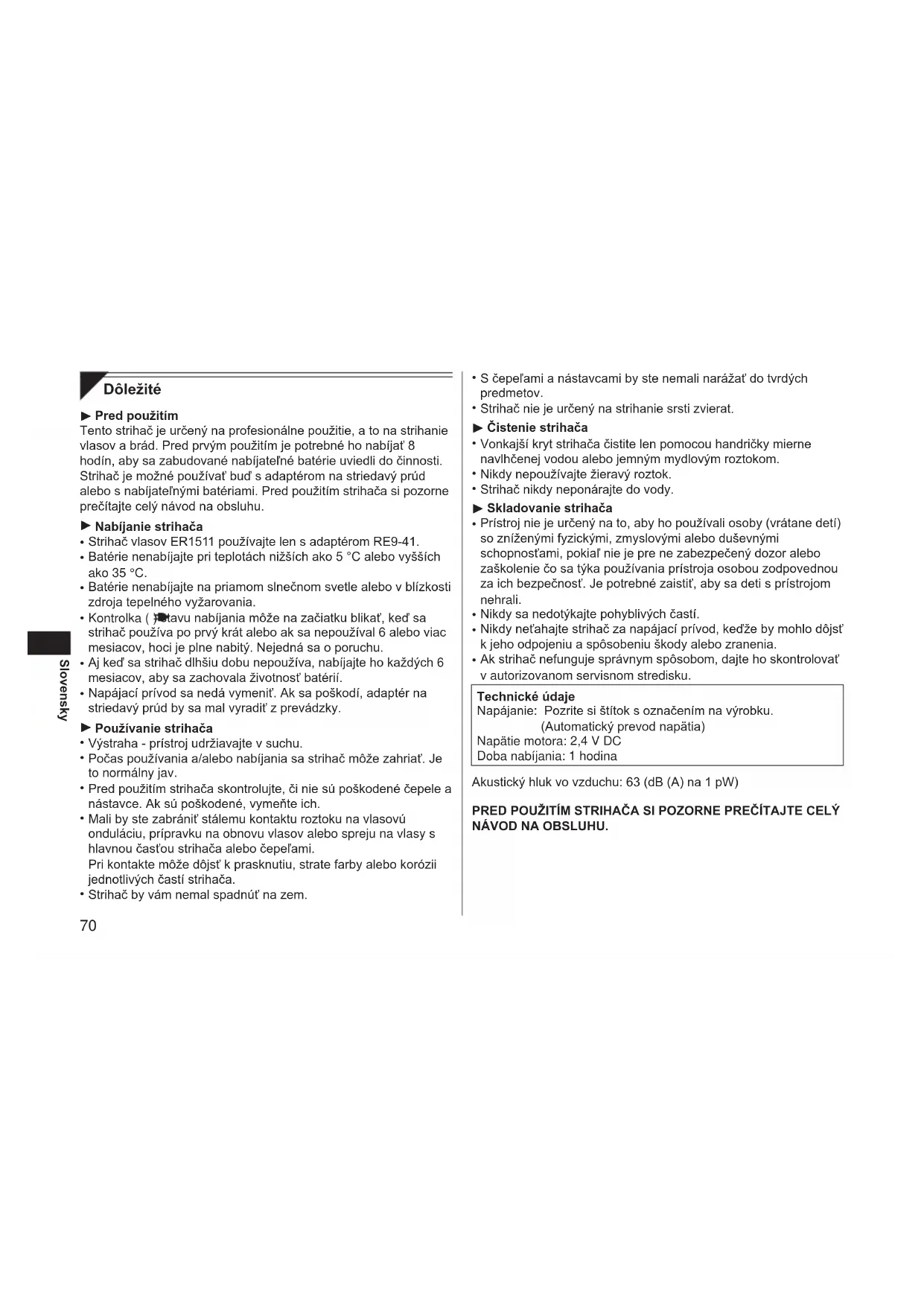 S čepeľami a nástavcami by ste nemali narážať do tvrdých predmetov. Strihač nie je určený na strihanie srsti zvierat. Čistenie strihača Vonkajší kryt strihača čistite len pomocou handričky mierne navlhčenej vodou alebo jemným mydlovým roztokom. Nikdy nepoužívajte žieravý roztok. Strihač nikdy neponárajte do vody. Skladovanie strihača Prístroj nie je určený na to, aby ho používali osoby (vrátane detí) so zníženými fyzickými, zmyslovými alebo duševnými schopnosťami, pokiaľ nie je pre ne zabezpečený dozor alebo zaškolenie čo sa týka používania prístroja osobou zodpovednou za ich bezpečnosť. Je potrebné zaistiť, aby sa deti s prístrojom nehrali. Nikdy sa nedotýkajte pohyblivých častí. Nikdy neťahajte strihač za napájací prívod, keďže by mohlo dôjsť k jeho odpojeniu a spôsobeniu škody alebo zranenia. Ak strihač nefunguje správnym spôsobom, dajte ho skontrolovať v autorizovanom servisnom stredisku. Technické údaje Napájanie: Pozrite si štítok s označením na výrobku. (Automatický prevod napätia) Napätie motora: 2,4 V DC Doba nabíjania: 1 hodina Akustický hluk vo vzduchu: 63 (dB (A) na 1 pW) PRED POUŽITÍM STRIHAČA SI POZORNE PREČÍTAJTE CELÝ NÁVOD NA OBSLUHU.