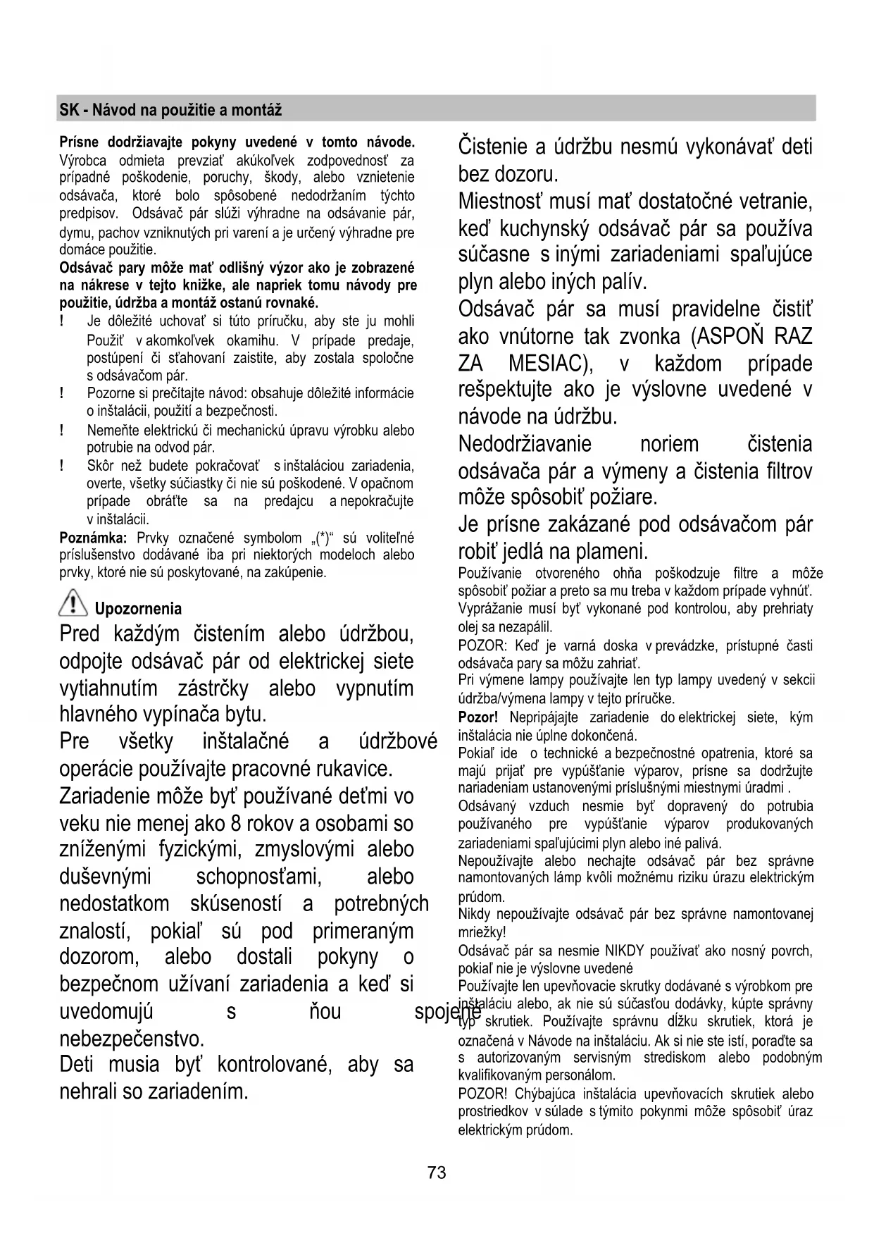 Jestliže osvětlení nefunguje, dříve než zavoláte servis si ověřte, zda jste správně nasadili žárovky do uložení. - Model s LED svítidly Digestoř je vybavena osvětlovacím systémem založeným na technologii DIOD. DIODY zaručují optimální osvětlení, s trvanlivostí až 10 krát delší než tradiční svídtila a umožňují úspory 90% elektrické energie. Pro výměny se obraťte na servisní službu.73 SK - Návod na použitie a montáž Prísne dodržiavajte pokyny uvedené v tomto návode. Výrobca odmieta prevziať akúkoľvek zodpovednosť za prípadné poškodenie, poruchy, škody, alebo vznietenie odsávača, ktoré bolo spôsobené nedodržaním týchto predpisov. Odsávač pár slúži výhradne na odsávanie pár, dymu, pachov vzniknutých pri varení a je určený výhradne pre domáce použitie. Odsávač pary môže mať odlišný výzor ako je zobrazené na nákrese v tejto knižke, ale napriek tomu návody pre použitie, údržba a montáž ostanú rovnaké. ! Je dôležité uchovať si túto príručku, aby ste ju mohli Použiť v akomkoľvek okamihu. V prípade predaje, postúpení či sťahovaní zaistite, aby zostala spoločne s odsávačom pár. ! Pozorne si prečítajte návod: obsahuje dôležité informácie o inštalácii, použití a bezpečnosti. ! Nemeňte elektrickú či mechanickú úpravu výrobku alebo potrubie na odvod pár. ! Skôr než budete pokračovať s inštaláciou zariadenia, overte, všetky súčiastky či nie sú poškodené. V opačnom prípade obráťte sa na predajcu a nepokračujte v inštalácii. Poznámka: Prvky označené symbolom „(*)“ sú voliteľné príslušenstvo dodávané iba pri niektorých modeloch alebo prvky, ktoré nie sú poskytované, na zakúpenie. Upozornenia Pred každým čistením alebo údržbou, odpojte odsávač pár od elektrickej siete vytiahnutím zástrčky alebo vypnutím hlavného vypínača bytu. Pre všetky inštalačné a údržbové operácie používajte pracovné rukavice. Zariadenie môže byť používané deťmi vo veku nie menej ako 8 rokov a osobami so zníženými fyzickými, zmyslovými alebo duševnými schopnosťami, alebo nedostatkom skúseností a potrebných znalostí, pokiaľ sú pod primeraným dozorom, alebo dostali pokyny o bezpečnom užívaní zariadenia a keď si uvedomujú s ňou spojené nebezpečenstvo. Deti musia byť kontrolované, aby sa nehrali so zariadením. Čistenie a údržbu nesmú vykonávať deti bez dozoru. Miestnosť musí mať dostatočné vetranie, keď kuchynský odsávač pár sa používa súčasne s inými zariadeniami spaľujúce plyn alebo iných palív. Odsávač pár sa musí pravidelne čistiť ako vnútorne tak zvonka (ASPOŇ RAZ ZA MESIAC), v každom prípade rešpektujte ako je výslovne uvedené v návode na údržbu. Nedodržiavanie noriem čistenia odsávača pár a výmeny a čistenia filtrov môže spôsobiť požiare. Je prísne zakázané pod odsávačom pár robiť jedlá na plameni. Používanie otvoreného ohňa poškodzuje filtre a môže spôsobiť požiar a preto sa mu treba v každom prípade vyhnúť. Vyprážanie musí byť vykonané pod kontrolou, aby prehriaty olej sa nezapálil. POZOR: Keď je varná doska v prevádzke, prístupné časti odsávača pary sa môžu zahriať. Pri výmene lampy používajte len typ lampy uvedený v sekcii údržba/výmena lampy v tejto príručke. Pozor! Nepripájajte zariadenie do elektrickej siete, kým inštalácia nie úplne dokončená. Pokiaľ ide o technické a bezpečnostné opatrenia, ktoré sa majú prijať pre vypúšťanie výparov, prísne sa dodržujte nariadeniam ustanovenými príslušnými miestnymi úradmi . Odsávaný vzduch nesmie byť dopravený do potrubia používaného pre vypúšťanie výparov produkovaných zariadeniami spaľujúcimi plyn alebo iné palivá. Nepoužívajte alebo nechajte odsávač pár bez správne namontovaných lámp kvôli možnému riziku úrazu elektrickým prúdom. Nikdy nepoužívajte odsávač pár bez správne namontovanej mriežky! Odsávač pár sa nesmie NIKDY používať ako nosný povrch, pokiaľ nie je výslovne uvedené Používajte len upevňovacie skrutky dodávané s výrobkom pre inštaláciu alebo, ak nie sú súčasťou dodávky, kúpte správny typ skrutiek. Používajte správnu dĺžku skrutiek, ktorá je označená v Návode na inštaláciu. Ak si nie ste istí, poraďte sa s autorizovaným servisným strediskom alebo podobným kvalifikovaným personálom. POZOR! Chýbajúca inštalácia upevňovacích skrutiek alebo prostriedkov v súlade s týmito pokynmi môže spôsobiť úraz elektrickým prúdom.74 Tento spotrebič je označený v súlade s európskou smernicou 2012/19/EC o likvidácii elektrického a elektronického zariadenia (WEEE). Uistením sa, že tento výrobok bol po svojej životnosti odstránený správnym spôsobom, užívateľ prispieva k predchádzaniu možným negatívnym následkom pre životné prostredie a zdravie. Symbol výrobku alebo na jeho sprievodnej dokumentácii, upozorňuje, že s týmto výrobkom sa nesmie zaobchádzať ako s domácim odpadom, ale musí byť odovzdaný do príslušné miesta zberu pre recykláciu elektrických a elektronických prístrojov. Zbaviť sa ho riadením sa podľa miestnych zákonov o odstránení odpadkov. Kvôli dokonalejším informáciám o zaobchádzaní, znovuzískaní a recyklácii tohto výrobku, kontaktujte príslušné miestne úrady, služby pre zber domáceho odpadu alebo predajňu , v ktorej výrobok bol zakúpený. Prístroj bol navrhnutý, testovaný a vyrobený v súlade s: