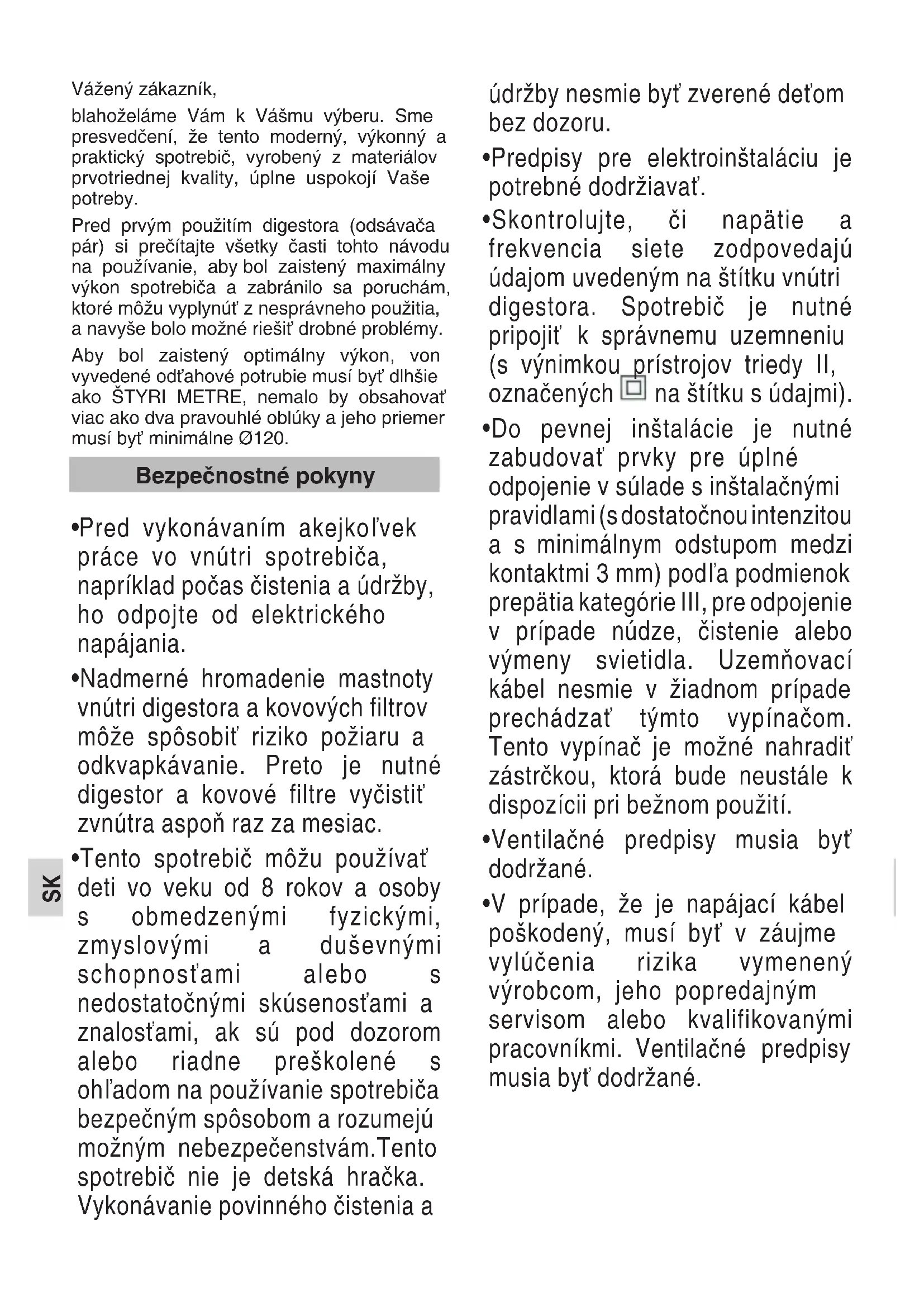 Замініть або очистить фільтри з активованим вугіллям і/ або металеві фільтри - в залежності від ситуації. Виділіть перешкоду.SK Vážený zákazník, blahoželáme Vám k Vášmu výberu. Sme presvedčení, že tento moderný, výkonný a praktický spotrebič, vyrobený z materiálov prvotriednej kvality, úplne uspokojí Vaše potreby. Pred prvým použitím digestora (odsávača pár) si prečítajte všetky časti tohto návodu na používanie, aby bol zaistený maximálny výkon spotrebiča a zabránilo sa poruchám, ktoré môžu vyplynúť z nesprávneho použitia, a navyše bolo možné riešiť drobné problémy. Aby bol zaistený optimálny výkon, von vyvedené odťahové potrubie musí byť dlhšie ako ŠTYRI METRE, nemalo by obsahovať viac ako dva pravouhlé oblúky a jeho priemer musí byť minimálne Ø120.