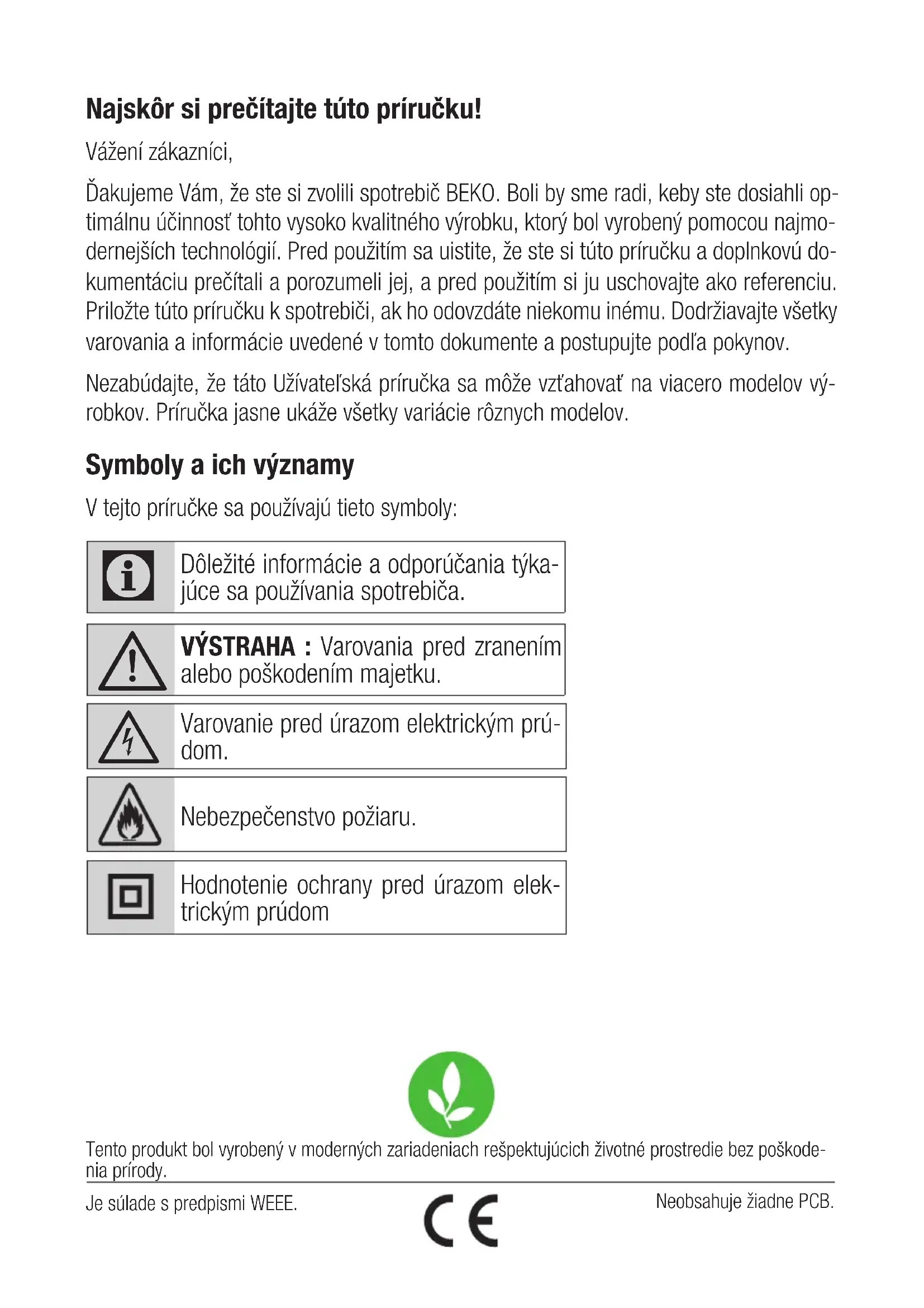 Varovanie pred úrazom elektrickým prú- dom. Nebezpečenstvo požiaru. Hodnotenie ochrany pred úrazom elek- trickým prúdom Je súlade s predpismi WEEE.Neobsahuje žiadne PCB.Tento produkt bol vyrobený v moderných zariadeniach rešpektujúcich životné prostredie bez poškode-nia prírody.190 / SK Odsávač pár / Užívateľská príručka 1 Dôležité bezpečnostné a environmentálne pokyny