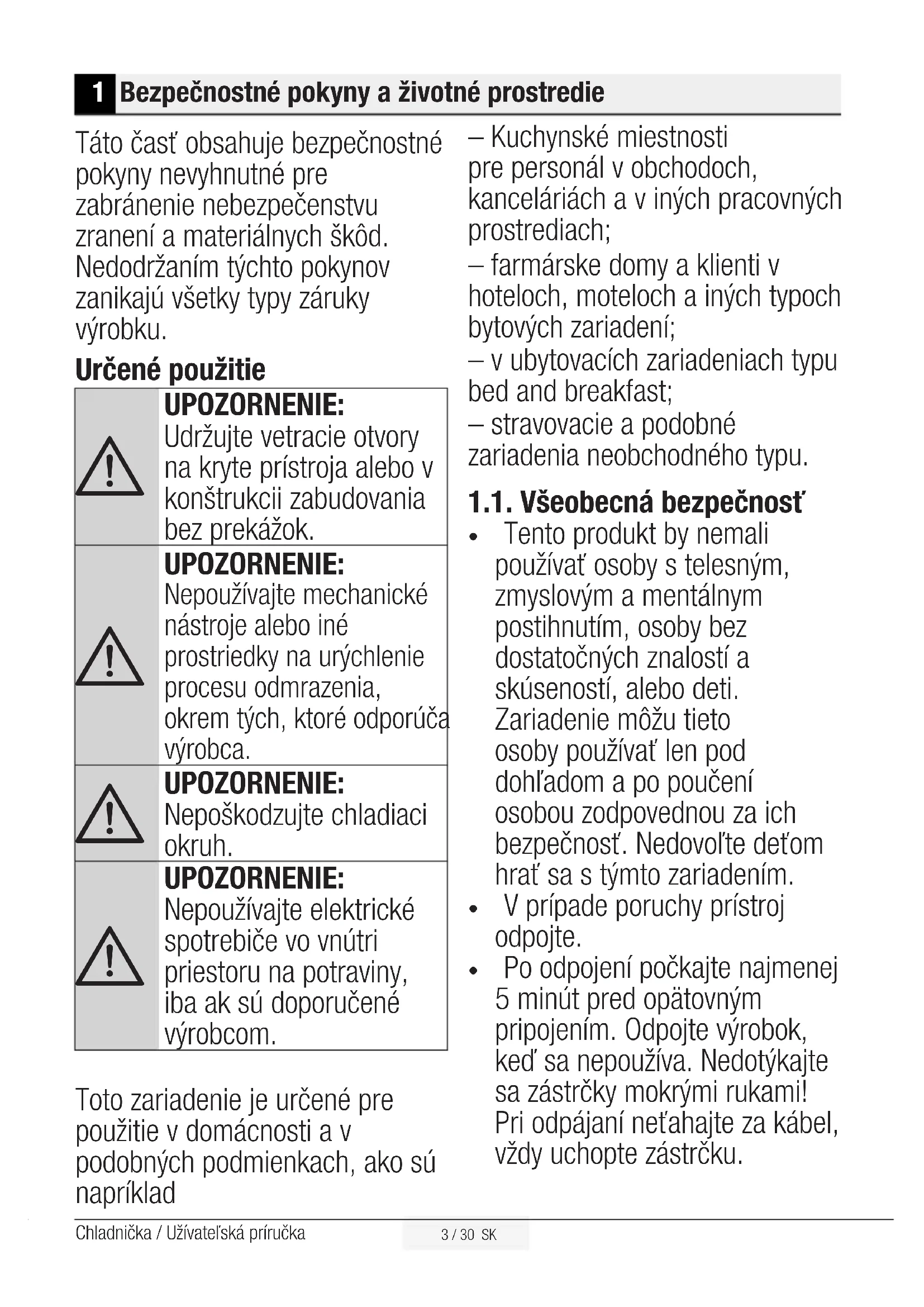 6 Údržba a čistenie 27 6.1. Prevencia pred zápachom . . . . . . . . . . . . . 27 6.2. Ochrana plastových povrchov . . . . . . . . . . 27 7 Riešenie problémov 28 Obsah3 / 30 SKChladnička / Užívateľská príručka 1 Bezpečnostné pokyny a životné prostredie Táto časť obsahuje bezpečnostné pokyny nevyhnutné pre zabránenie nebezpečenstvu zranení a materiálnych škôd. Nedodržaním týchto pokynov zanikajú všetky typy záruky výrobku. Určené použitie